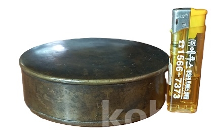 옛 화장용 도구로 분곽(분갑이 맞는 말이라고도 하고)이라고도 합니다. 얇은 적동재질로 오늘날 처럼 화장용 분을 담아 사용하던것. 통안쪽에 그때 담았던 하얀 분가루가 보이나 오래되어선가 분냄세, 향은 나지 않읍니다. 지금의 분통과 비교 형태는 동일하나 크기가 아주 큰편으로 뚜껑은 밖에서 안쪽으로 꼭 맞게 닫히고 통의 내/외부에 문양이나 조각이 일체 없고 어떤 표식도 없는것으로 보아 무명의 장인이 수공으로 만든게 아닌가 여겨집니다. 사진에 함께 촬영된 일회용 라이타와 코티분곽은 싸이즈 비교를 위한것으로 함께 가지는 않읍니다만 구매자분께서 필요하시다면 같이 보내겠읍니다.
