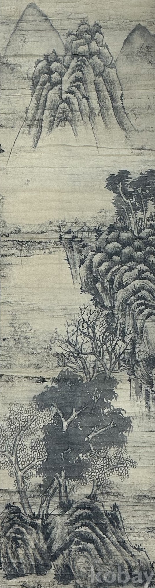 고요한 산수의 정취를 섬세하게 담은 수묵 산수화입니다. 안개처럼 번지는 먹의 농담(濃淡)과 부드러운 필치로 원경과 근경의 깊이를 표현하였으며, 산세의 중첩과 나무의 생동감 있는 묘사가 돋보입니다. 화면에는 평온한 자연의 기운이 깃들어 있어 감상자에게 고요한 사색의 시간을 선사합니다.