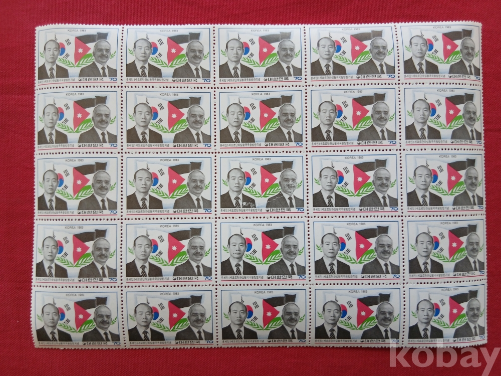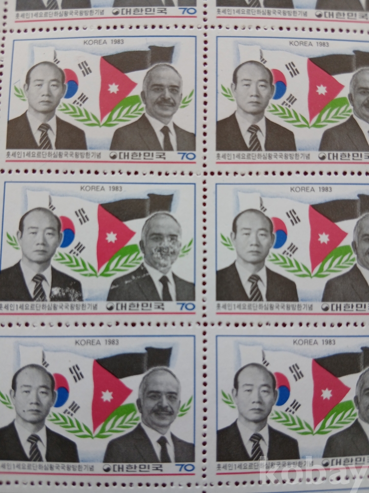 우표: 1세 후세인 요르단 국왕 방문 기념 우표 전지 (1982년 액면가 1750원)------미사용으로 상태 아주 양호 합니다
