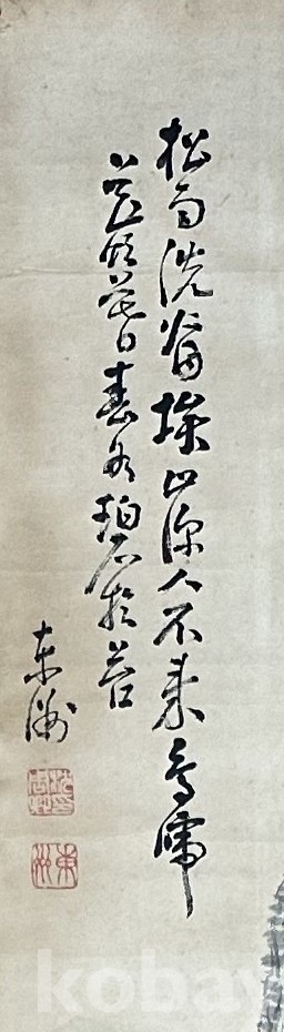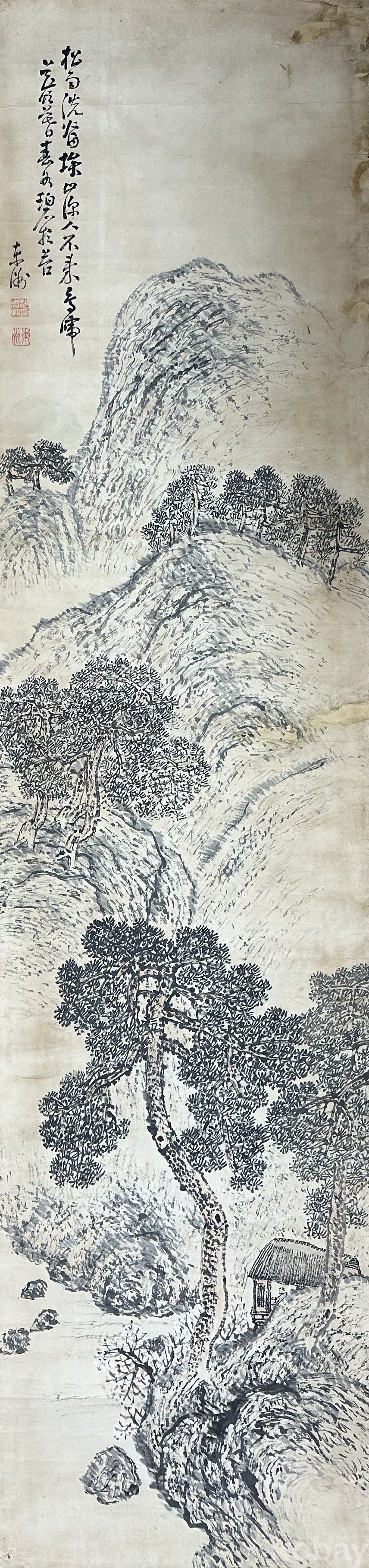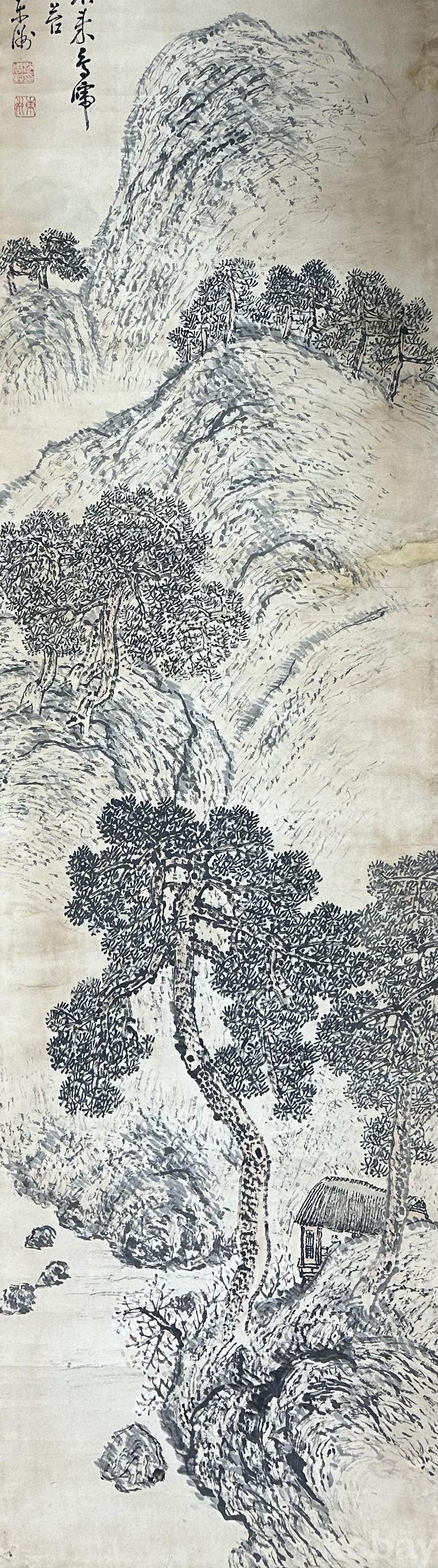 이 작품은 한국 산수화의 대표적 소재인 소나무를 중심으로 그려진 수묵채색화입니다. 힘차고 굳건한 소나무와 굽이치는 산세, 그리고 산속에 자리한 고즈넉한 초가가 화면에 조화를 이루며, 동양적 정취 속 자연의 고요함과 휴식을 감각적으로 표현하였습니다.