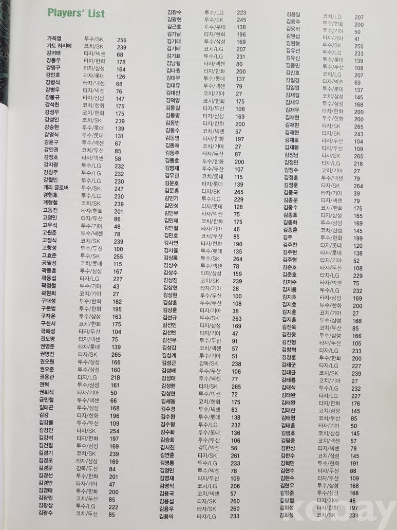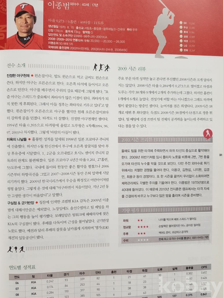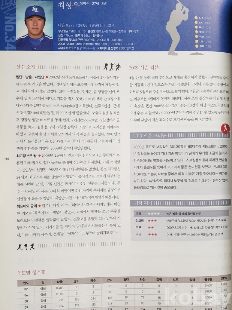 설명: 이 책은 베이스볼 2010 2010년 Baseball KBO 가 공식인증한 프로야구 스카우팅 리포트 - 한국경제신문 발행 프로야구 선수 등록 책입니다.