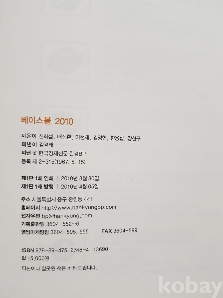 저자: 한국경제신문 야구팀, 발행처: 한국경제신문 , 발행일: 2010년 3월10일 , 규격: 21 * 28.5cm , 페이지: 285 , 상태: 연륜이 있지만 상태 상급 , 정가: 15.000원 , 수량: 1권
