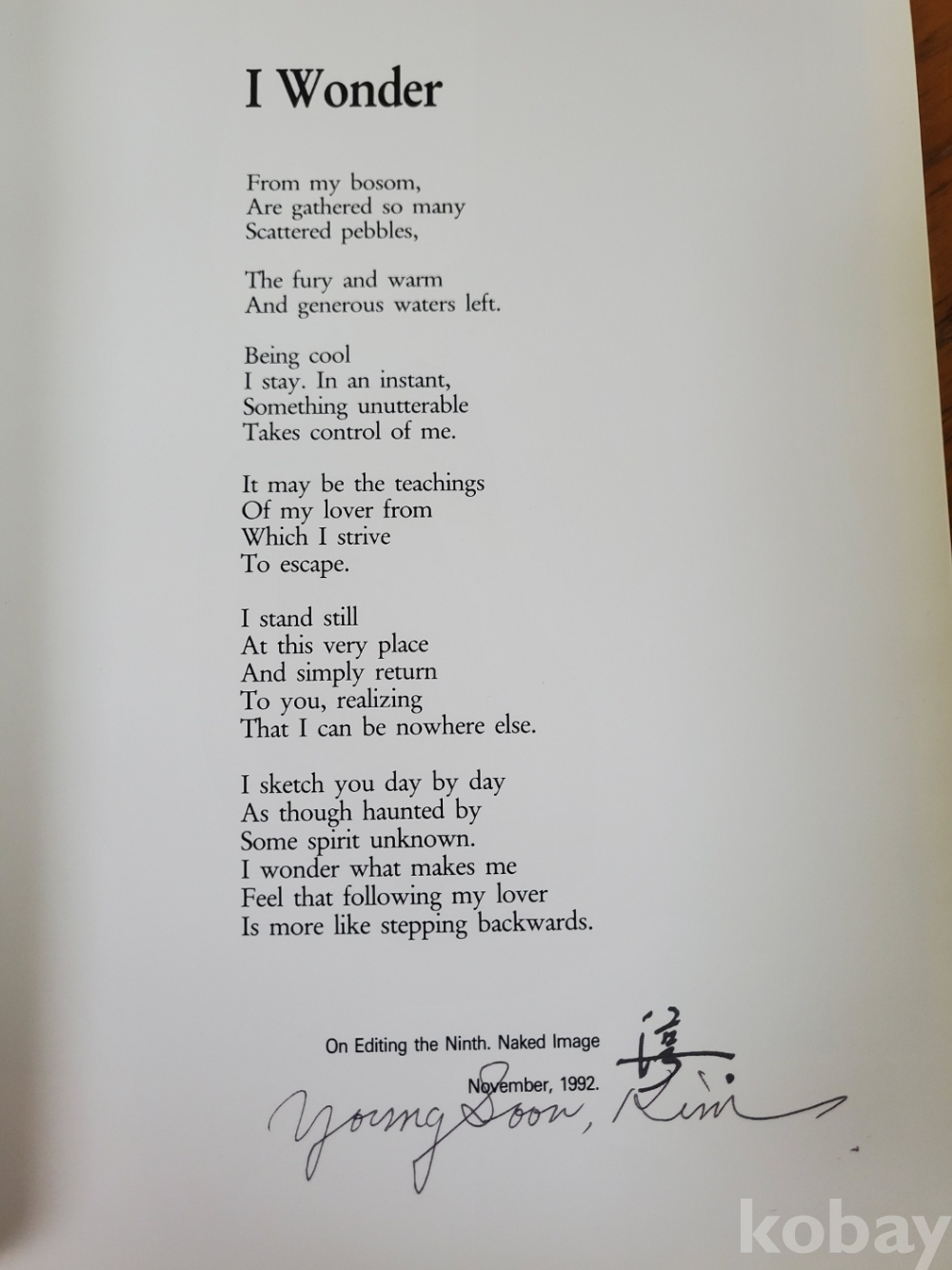 2. 서명본 : ‘웬지 자꾸’란 시 밑에 영어로 자필 서명 있음