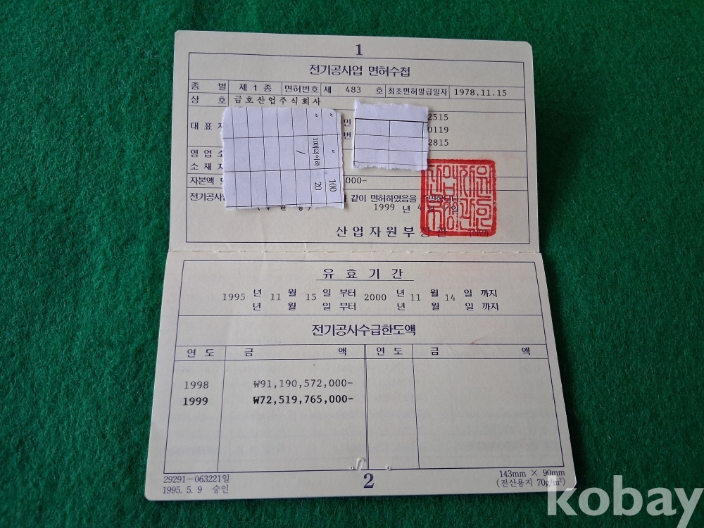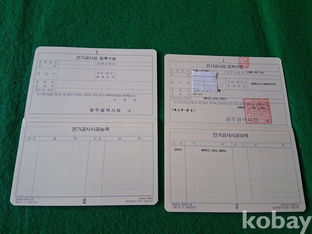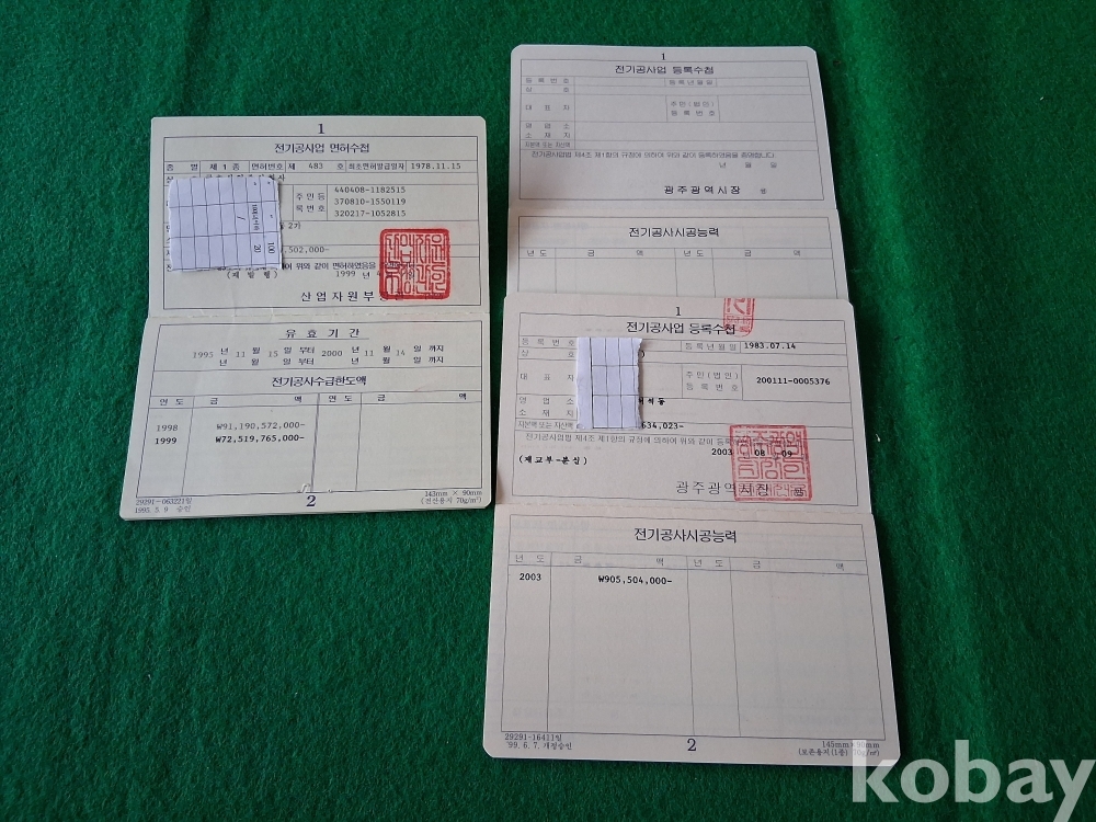 전기공사업면허수첩(산업자원부), 전기공사업 등록수첩(광주시) 등 3매