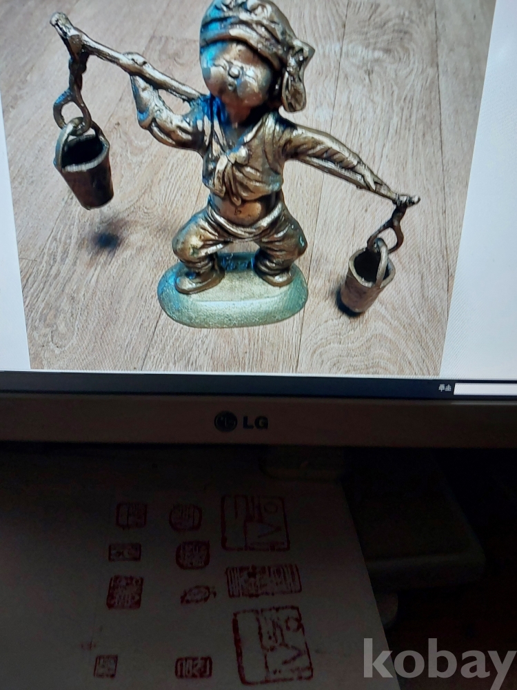 조형미 좋은 해학적인 물지개를 지고 있는 아동 브론즈 작품입니다.