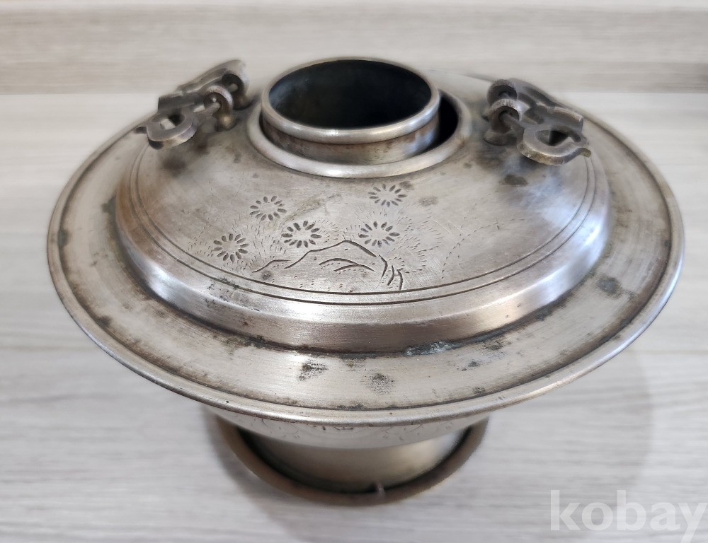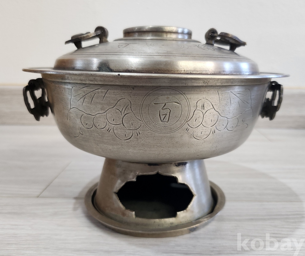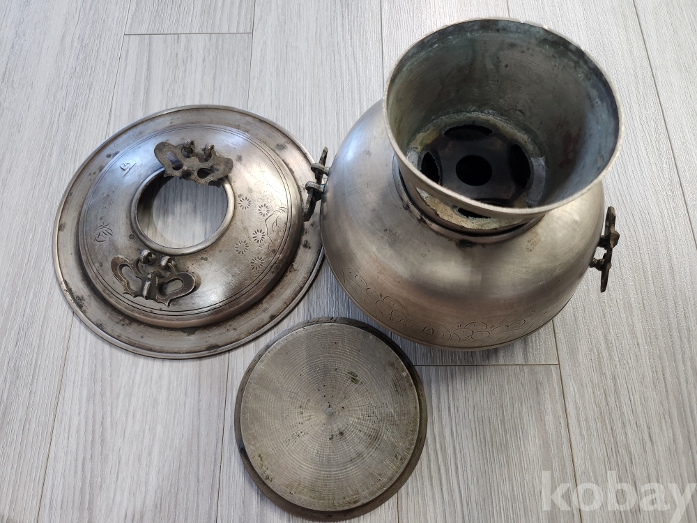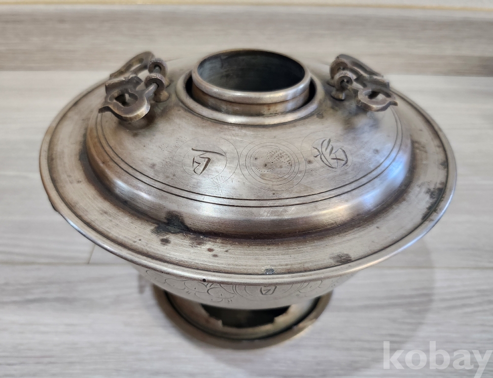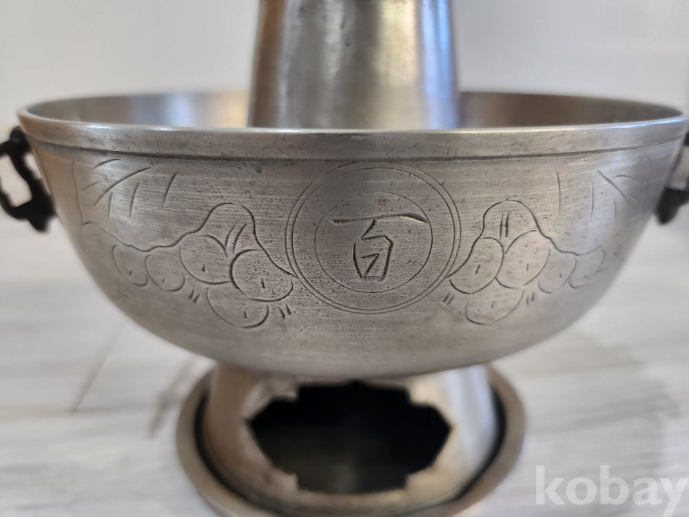 선조들이 사용한 백동으로 만들어진 신선로 입니다 투껑에 태극. 괴석에 국화꽃문양이 수작업으로 새겨져 있습니다 사진 상세히 올리니 참조바랍니다
