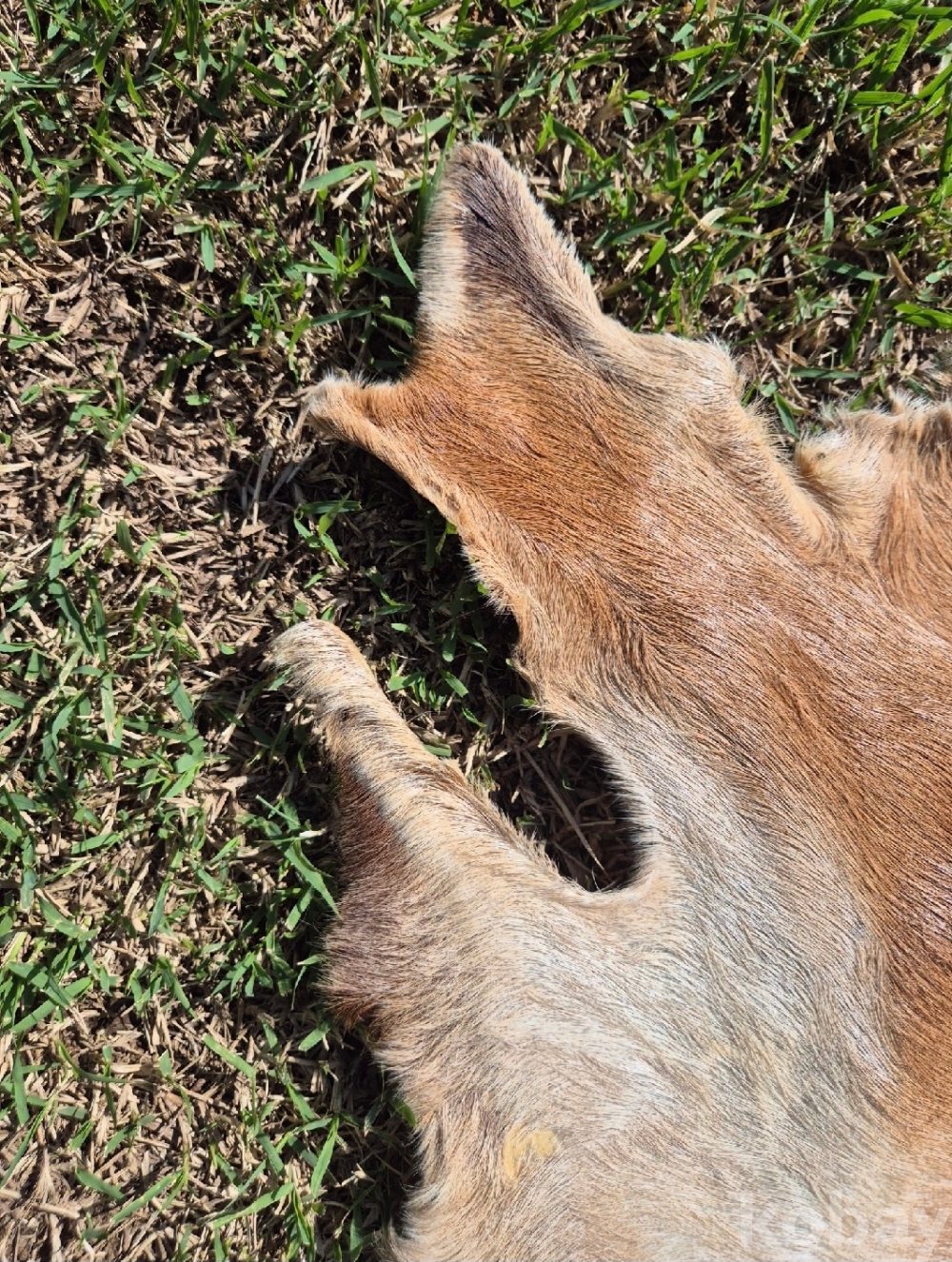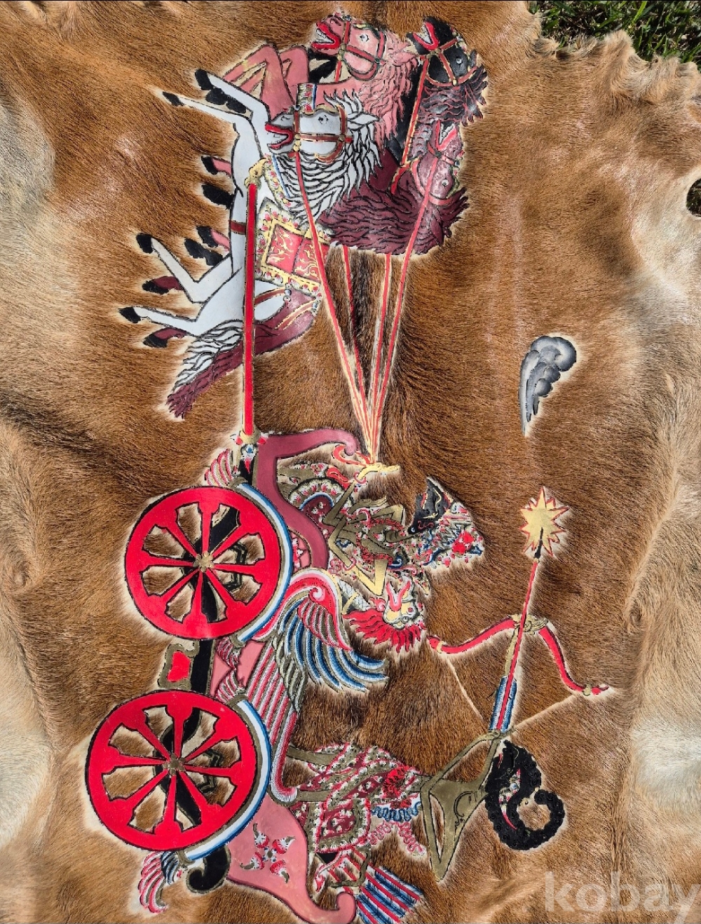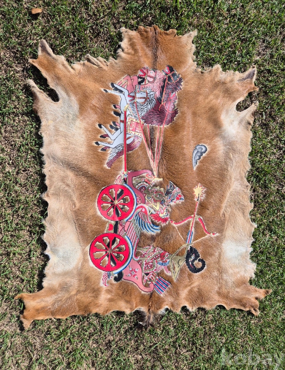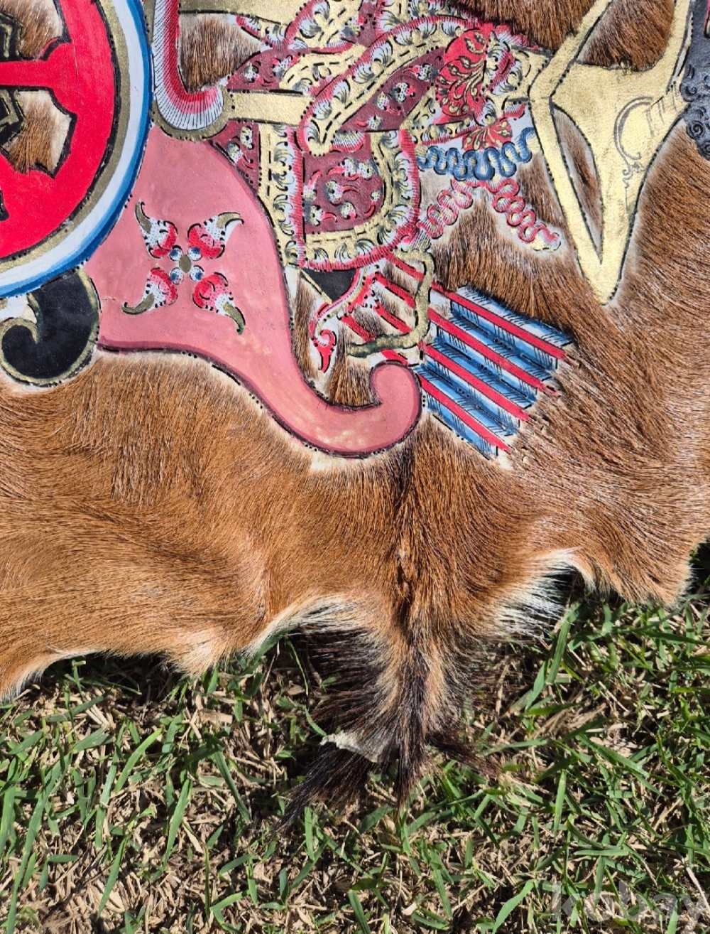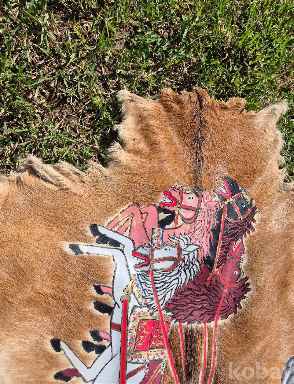 사슴 가죽에 전통적인 그림이 그려진 독특한 인테리어 소품이에요