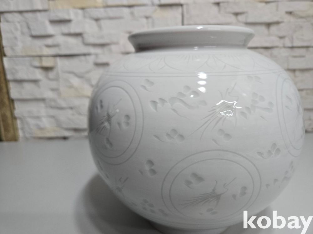 운학 문양이 음각으로 표현된 달 도자기 입니다.