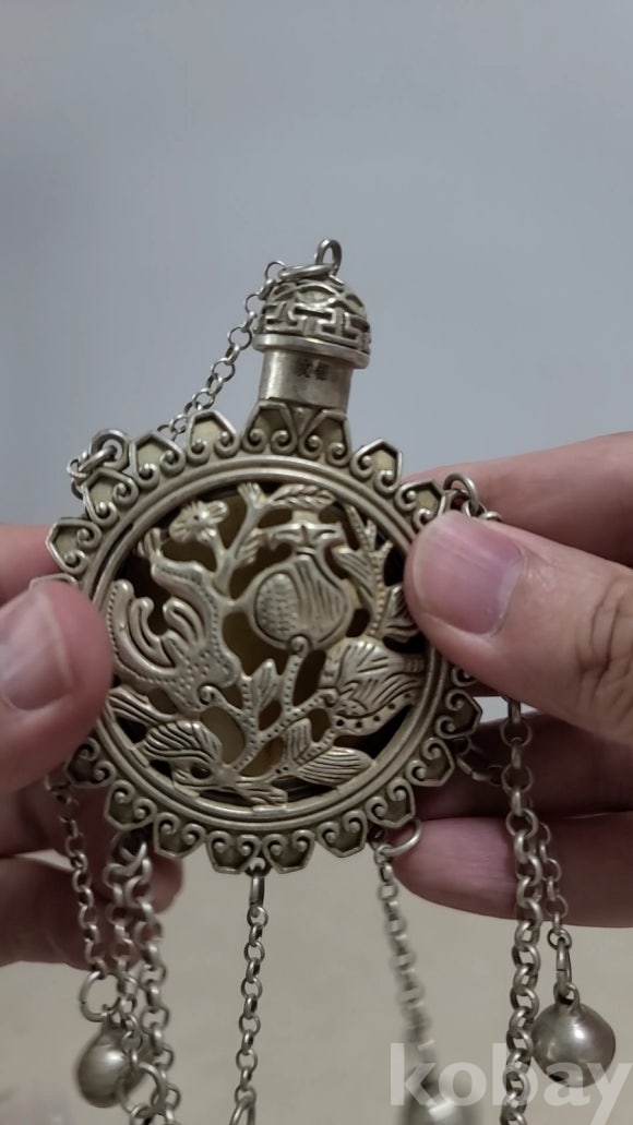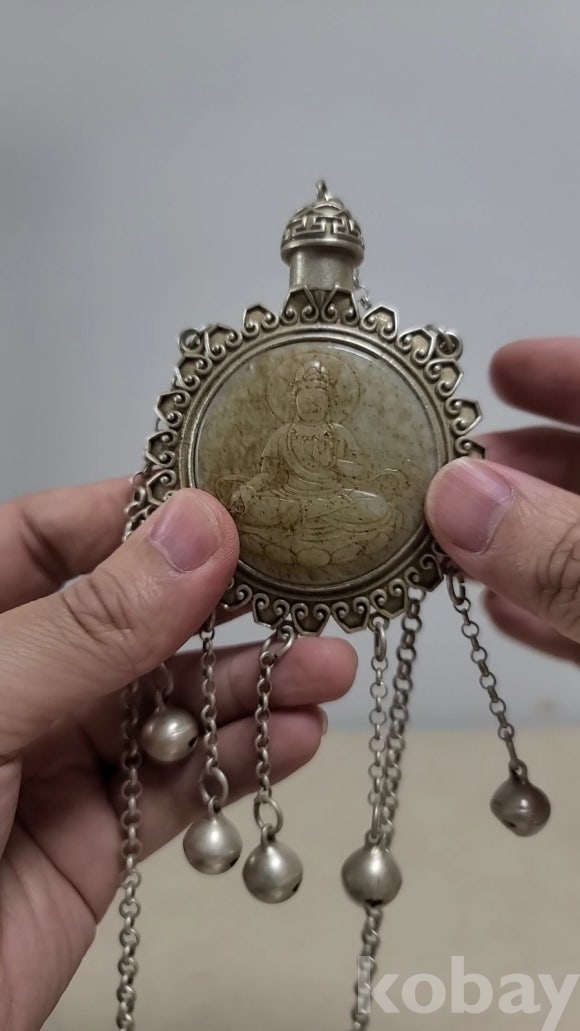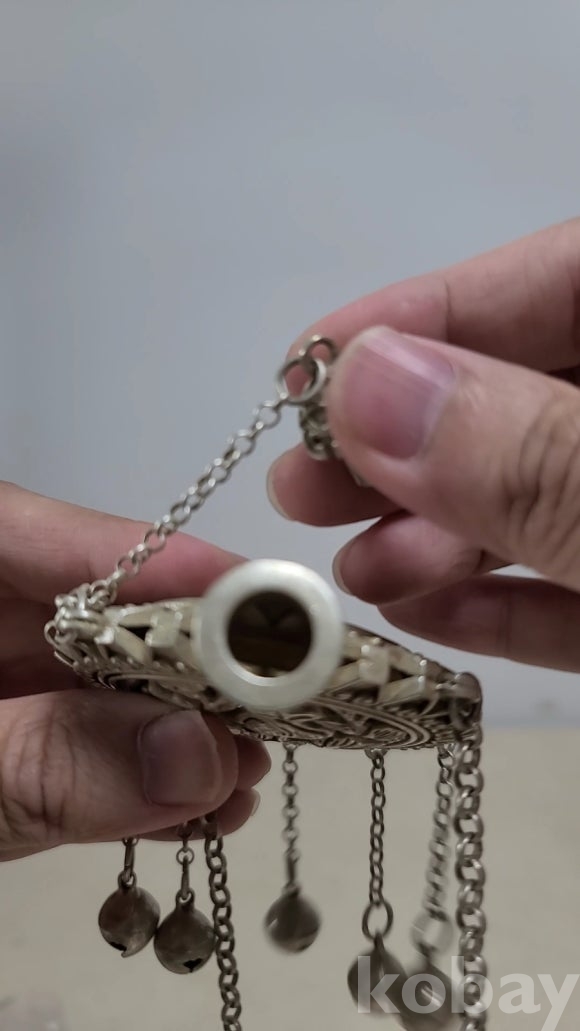 옥과 백동으로 잘 만든 오래된 향낭입니다 고리와 방울이 달려있고 옥의 투명도도 좋습니다