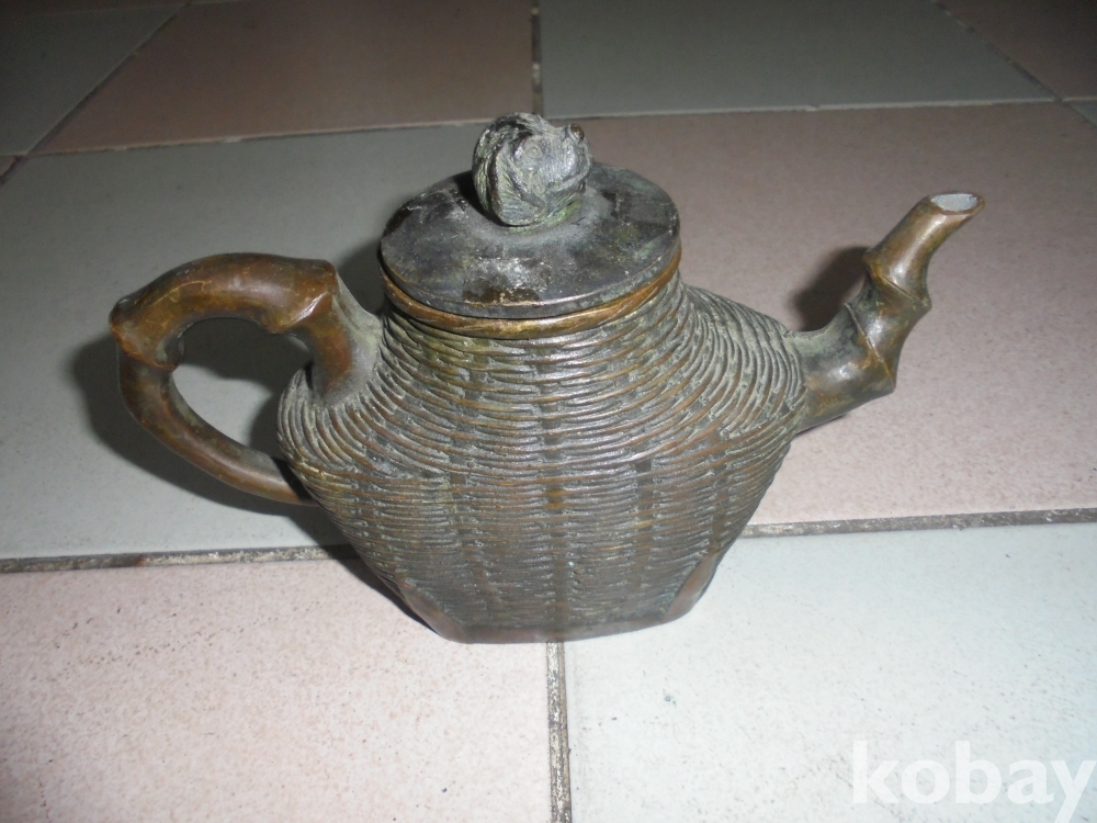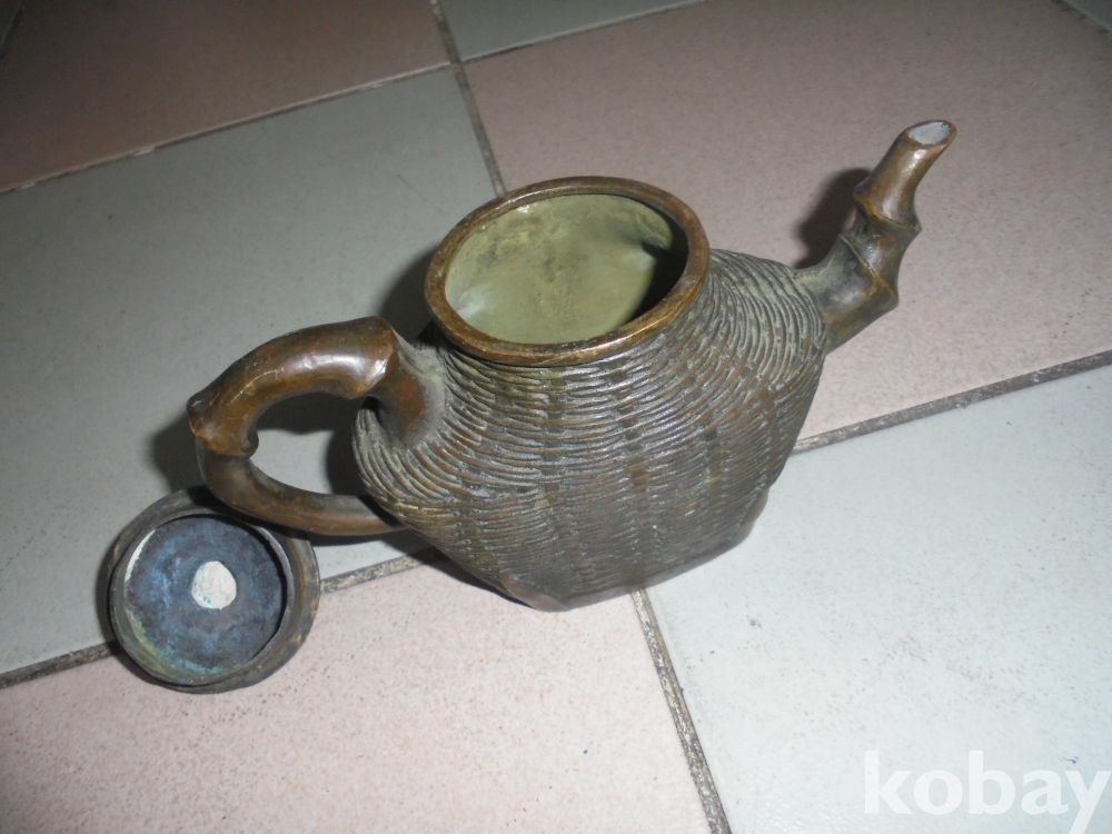 몸통에 대나무 죽공예로 얽혀있고 뚜껑 손잡이가 강아지머리 주자와 손잡이 대나무 뿌리형 찻물끓이는 예술적인 때물좋은 오래된 유기 찻주전자