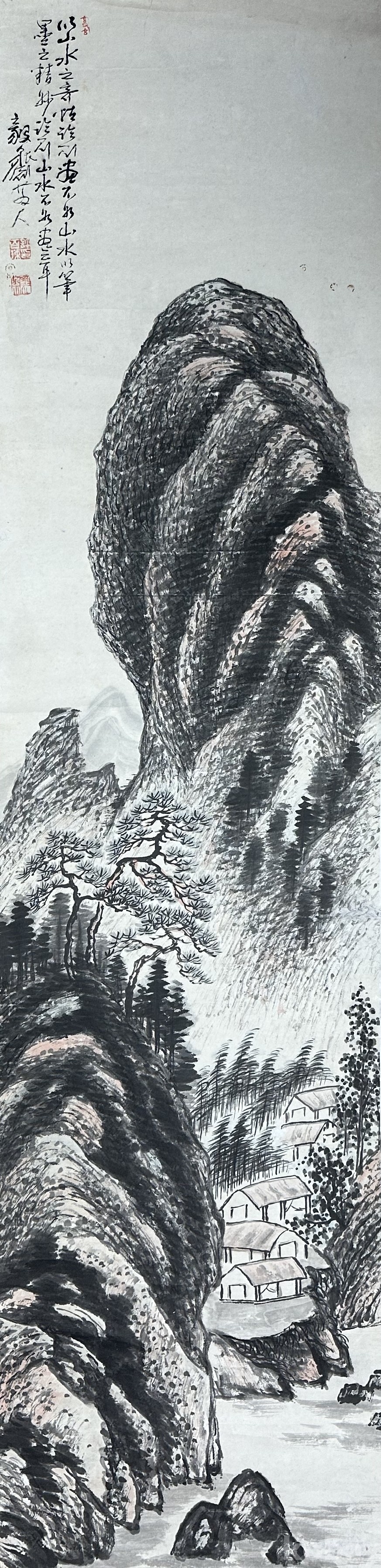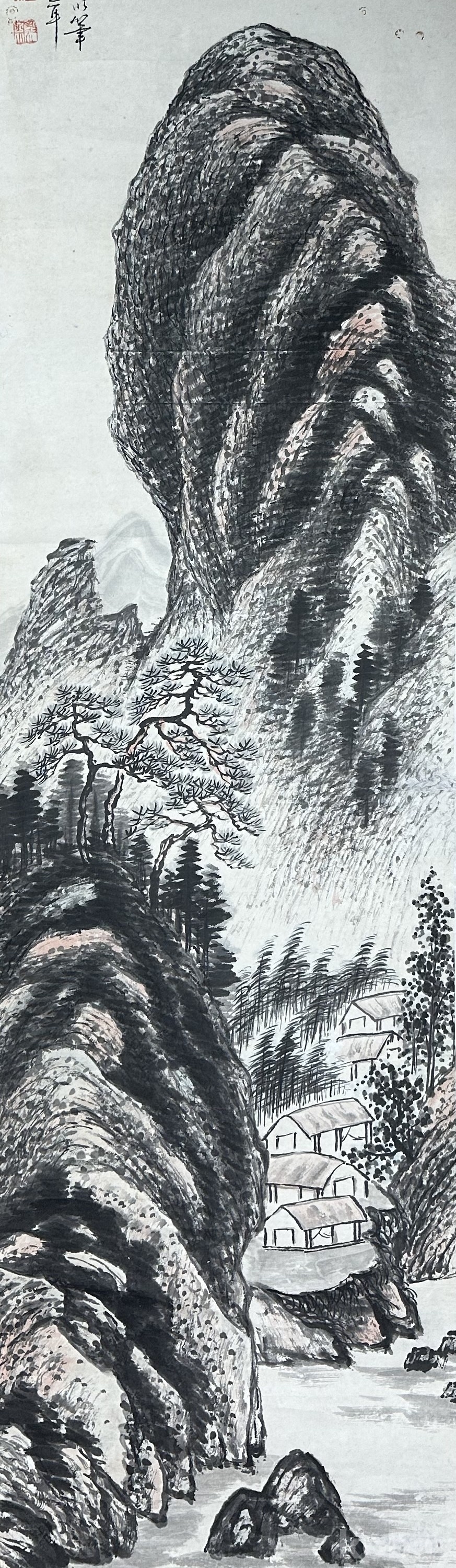 이 작품은 한국 전통 산수화의 미를 오롯이 담아낸 수묵채색화로, 웅대한 산맥과 그 속에 자연과 조화를 이루며 살아가는 인간의 삶을 정감 있게 표현하였습니다. 송림과 기암괴석, 그리고 평온한 산중의 집이 어우러져 자연의 생동감과 정적이 동시에 느껴지는 진경산수의 세계를 보여줍니다. 산과 바위의 표면은 준법(皴法)을 사용해 질감과 입체감이 섬세하게 드러나며, 먹과 담채의 농도 조절로 계절의 정취까지 담아내었습니다.