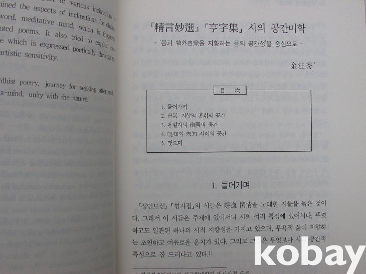 나말여초 문인 글쓰기, 김시습 불교시, 이이 <정언묘선>의 미학, 퇴계학파의 <심경부주> 이해, 식산 이만부, 열하일기 <앙엽기>, 석정 이정직, 이규보 시, <사기> 인식, 백거이 시집 동전, 한문교육용한자 선정 기초연구 등에 관한 글 11편이 실려 있다. 논문마다 별도의 목차와 영문초록이 있으며 책 뒤에 국문초록도 있다.