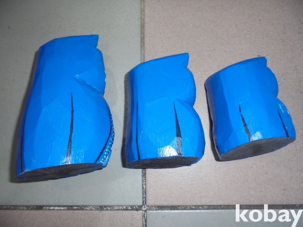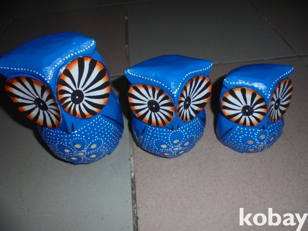 질좋은나무로 조각 진당채 사용한 행운과 재수 부자되는 멋있는 크고 중간 작은 푸른부엉이 3마리