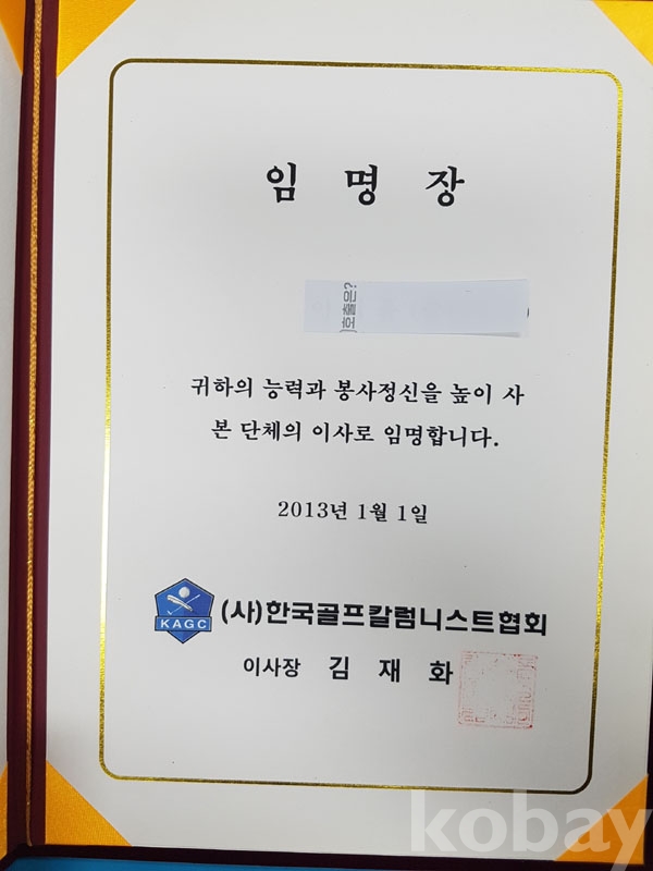 **** (사)한국골프칼럼니스트협회 이사 임명장 및 함께 들어있던 사진 등