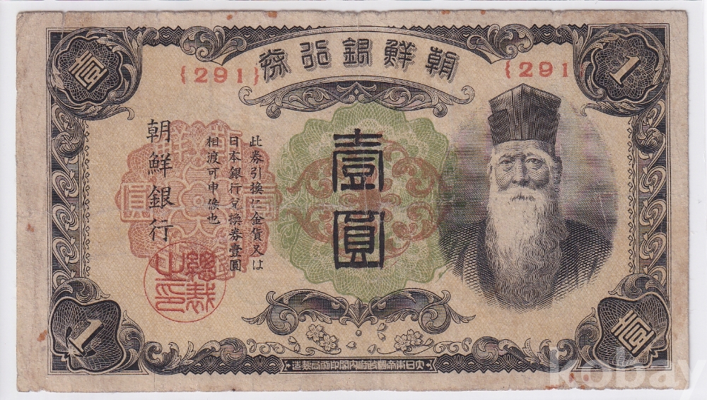 - 조선은행 1932년 개 일원 판번호 291번 무번호권 사용제 지폐