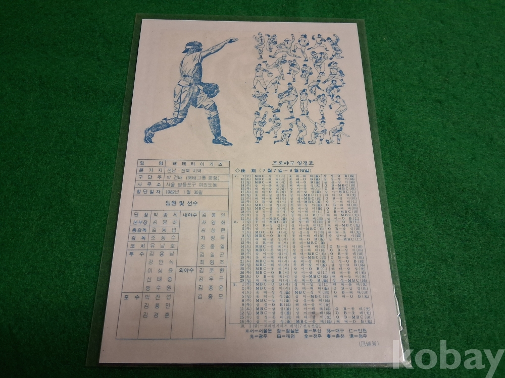 해태타이거즈 책받침-1982년도 원년 후반기 일정표