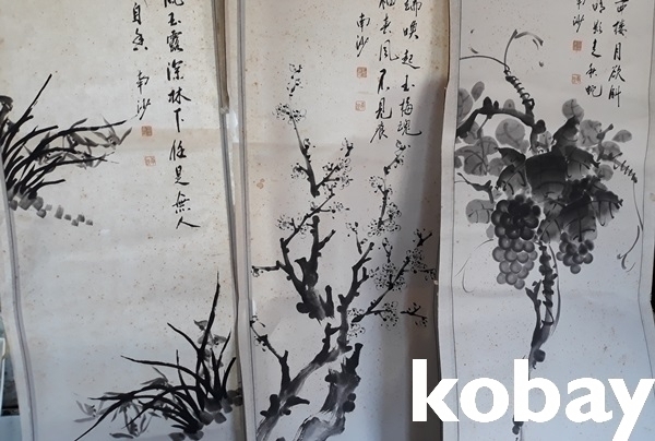 토담 먹으로 그린 병풍그림 6점 일괄 (작가사진참조)