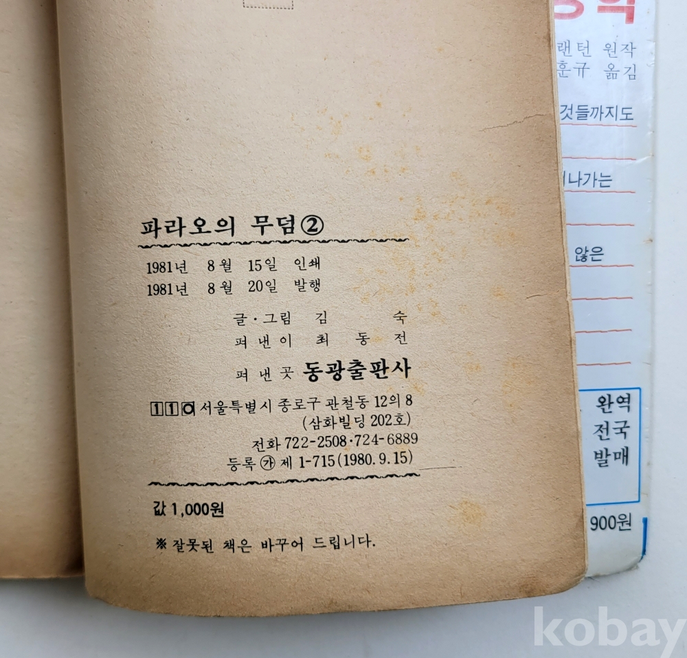 물 품 명 | 김숙 / 파라오의 무덤 (2) / 까투리순정만화 / 1981년 초판 / 동광출판사 |