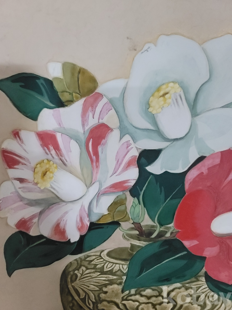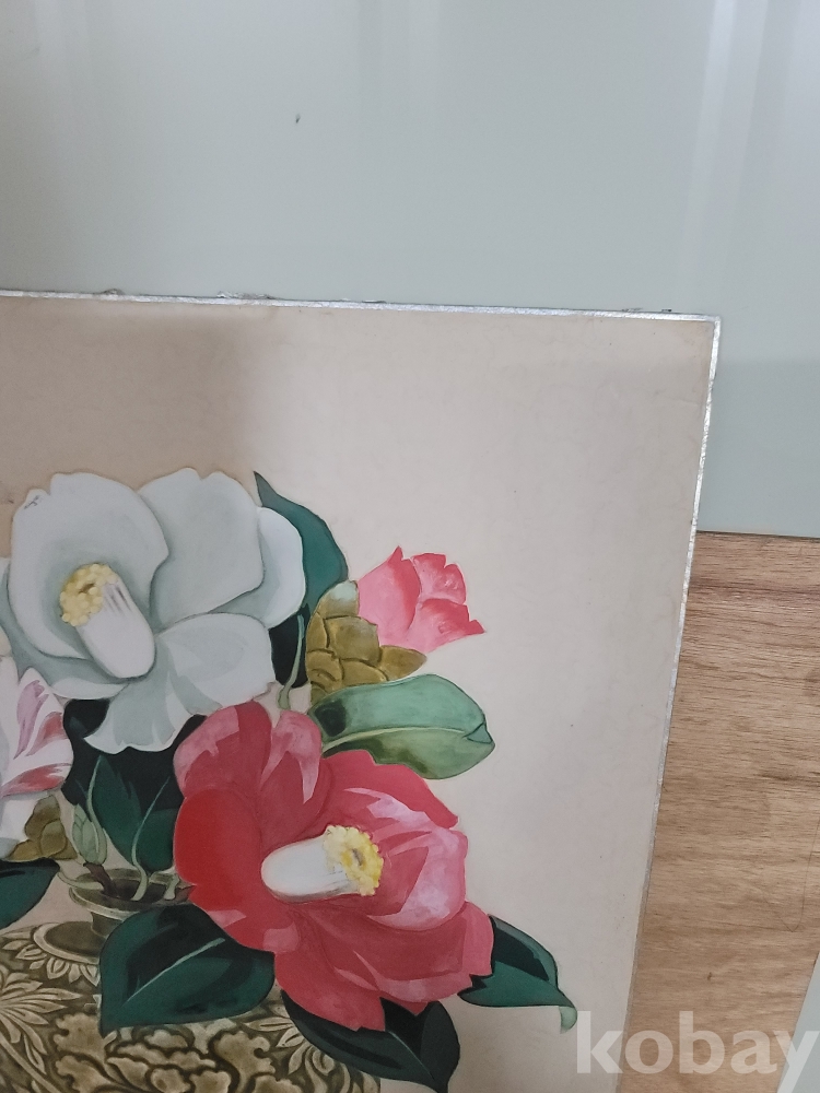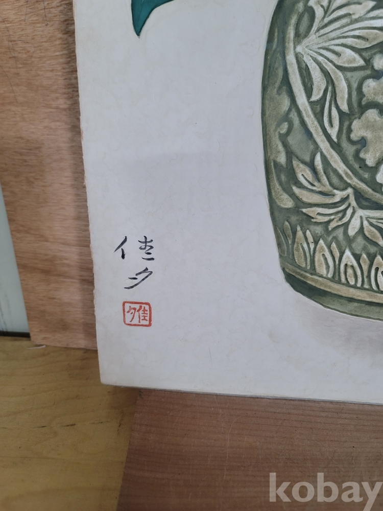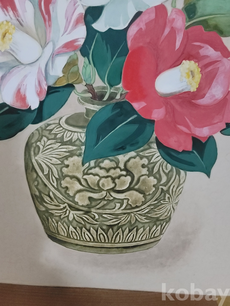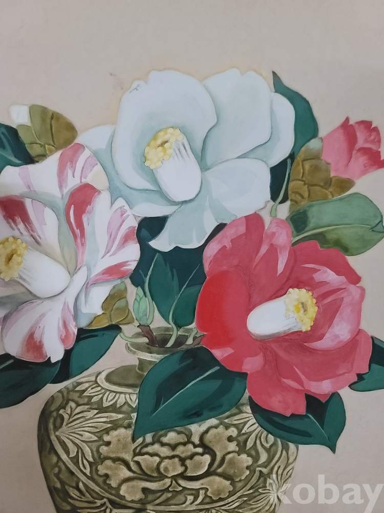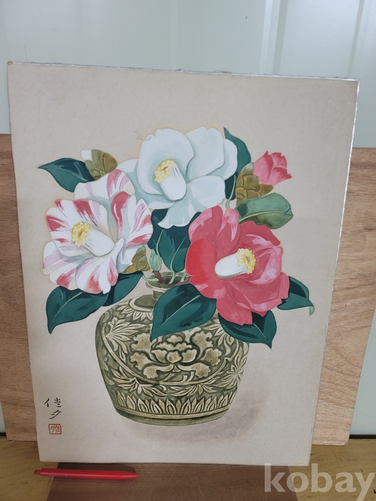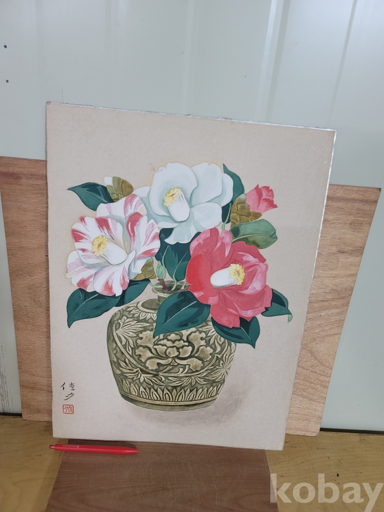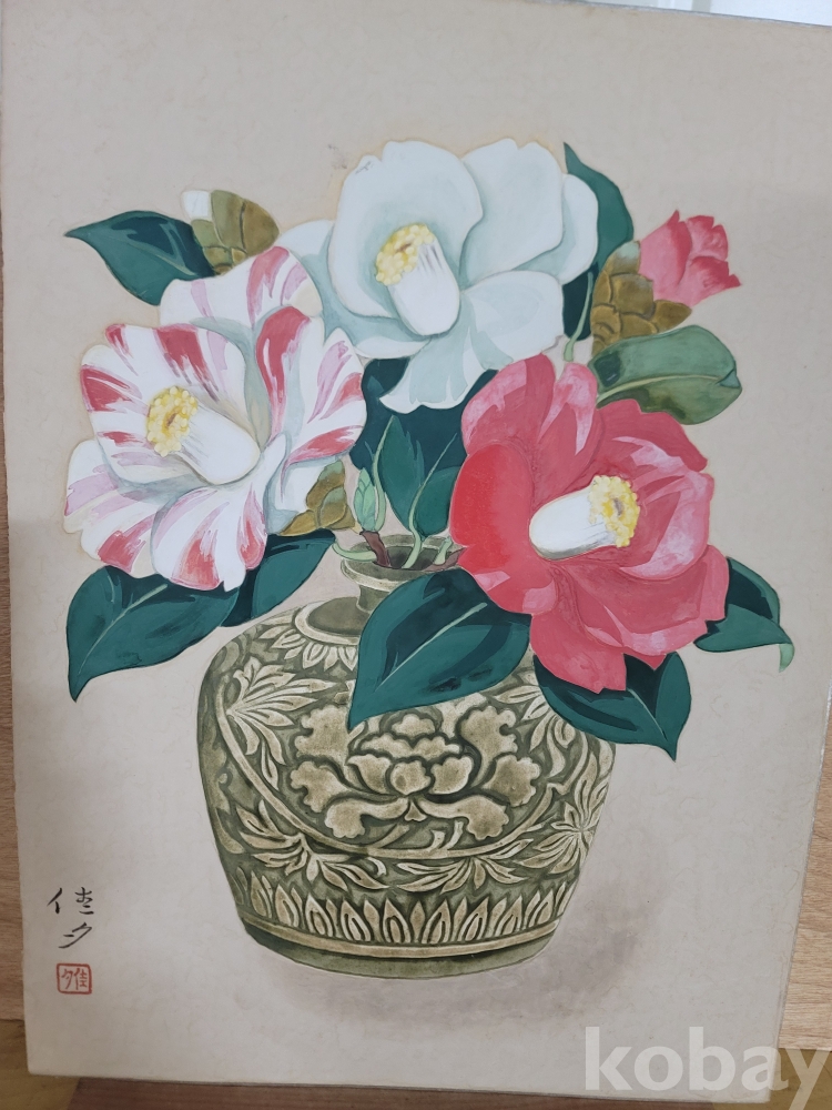 유명.. 일본 작가 동백 정물화 작품 / 도자기 화병 채색화 수결 참조