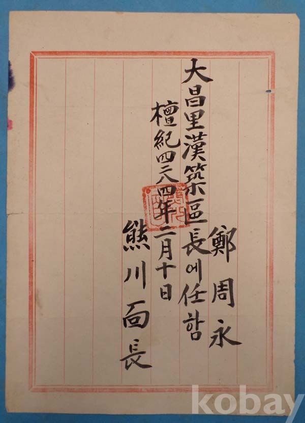 6.25전쟁중 1951년 大昌里漢築區長 임명장 (熊川面長)