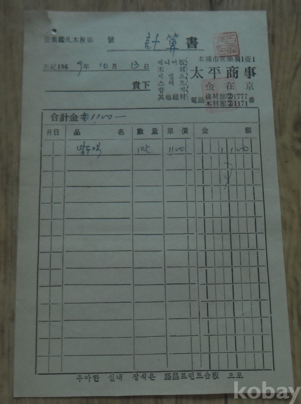 옛 영수증(계산서): 1969년 태평상사(목포)