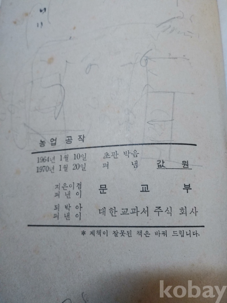 70년문교부초판발행 농업공작 책상태 낙장은없으나 낙서좀있고 마지막3장모서리 탈락있읍니다 참고바랍니다
