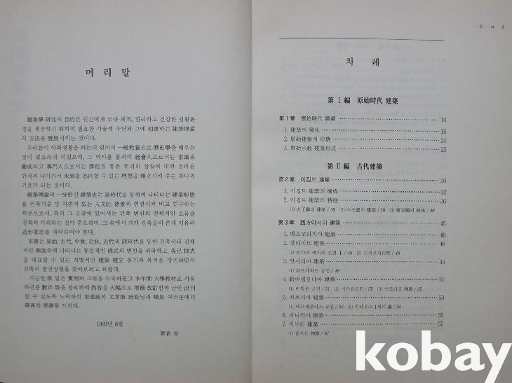 머리말에 건축사 전체의 조류 속에 나타나는 '통일적인 양식의 변천'을 파악하면서 각 건축의 발전상황을 찾아보려고 하였다며, 다년간 대학교재로 사용하던 중 수차의 판을 정리해 대폭 증보 개정하였다고 하였다.