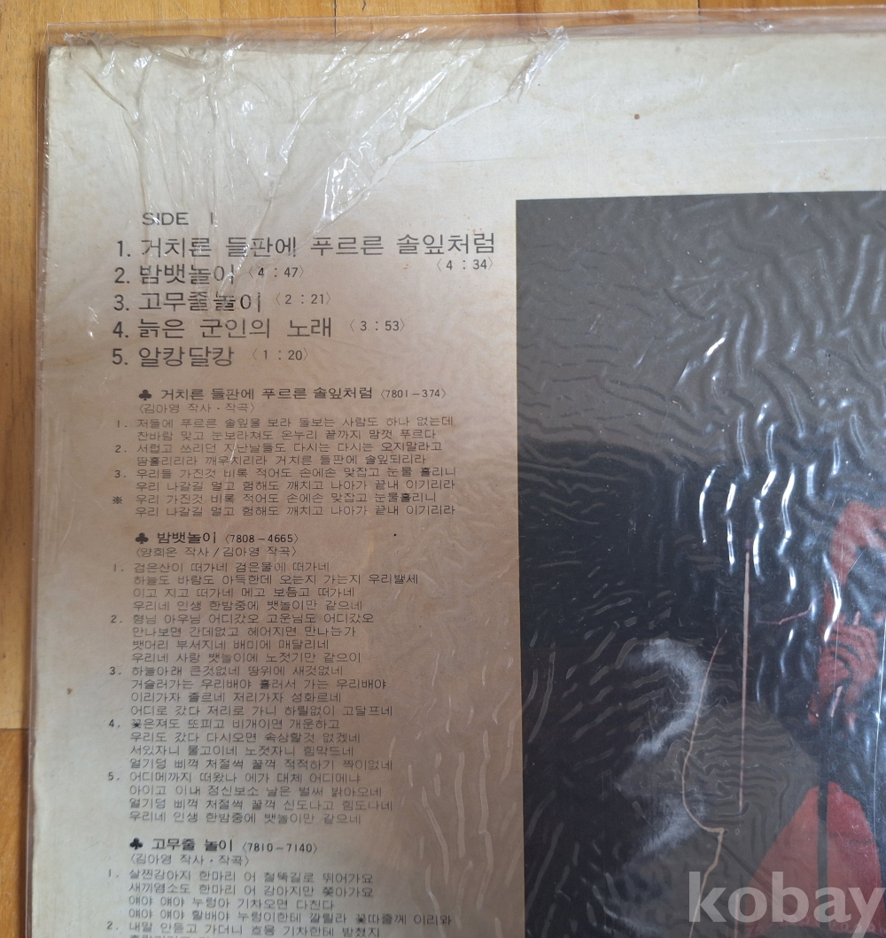 ##발매되자 마자 '늙은 군인의 노래'로 인하여 전량 회수되어 폐기조치되었고 판매금지가 된 비운의 음반이기에 미개봉음반은 구하기가 하늘의 별따기처럼 어렵고 제가 소장한 음반 이외에 본 적이 없습니다. 다만 아쉬운 점은 세월의 흐름과 몇번의 이사로 인하여 겉비닐 상단이 자연적인 트임과 보관 실수로 찢김이 있습니다.