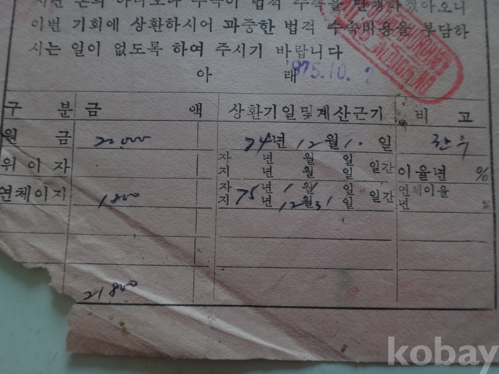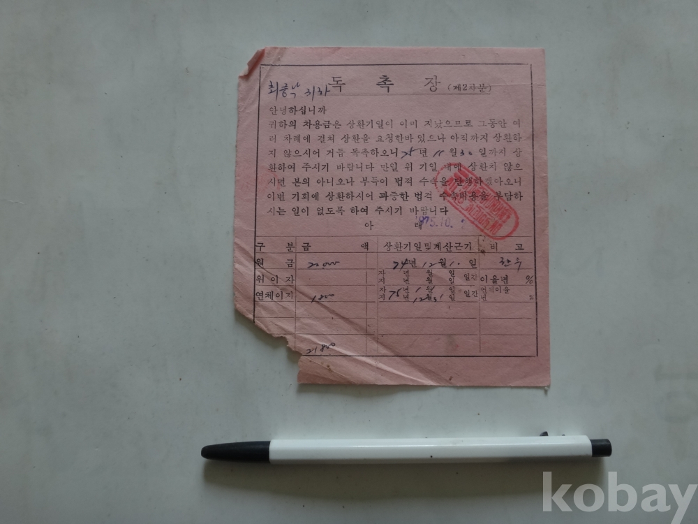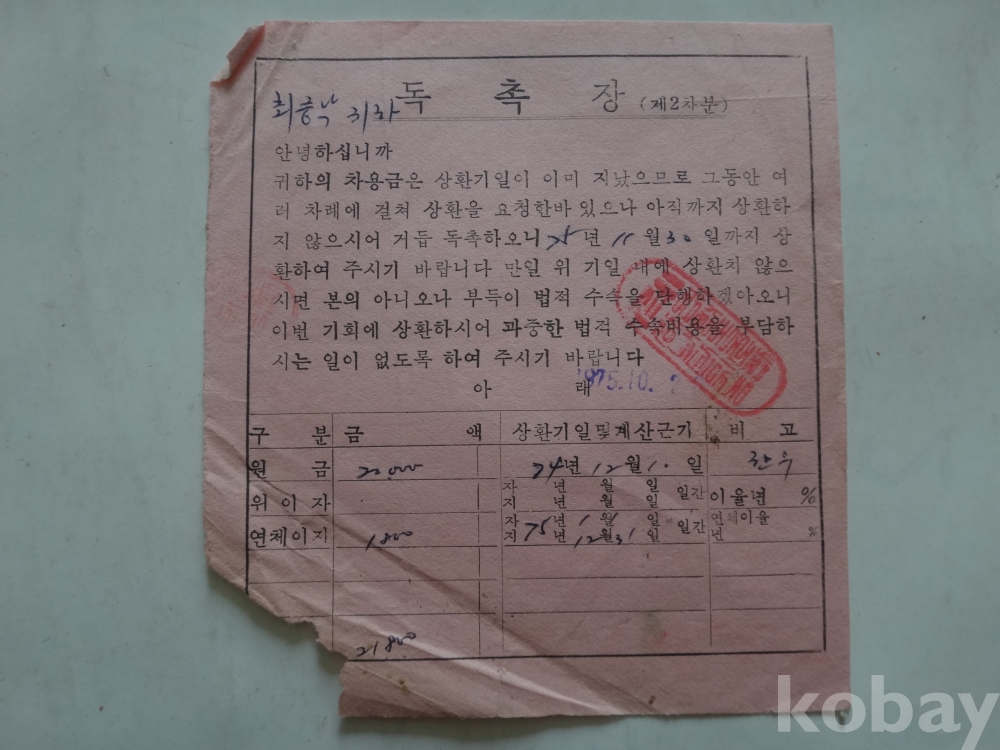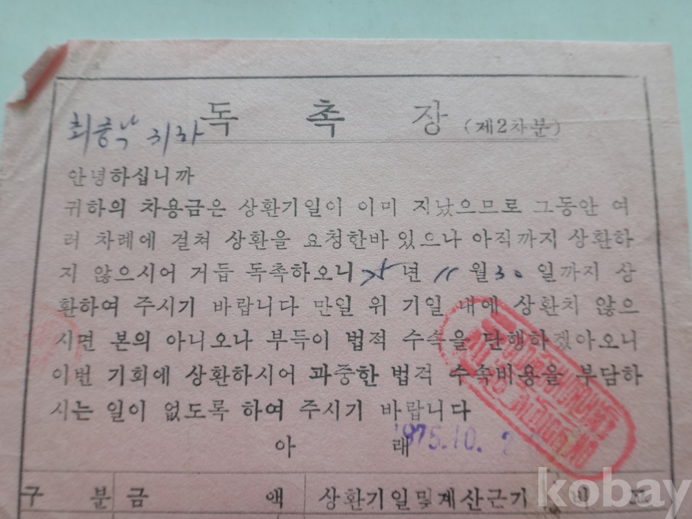 한우 - 차용금 상환 독촉장 (1975년)