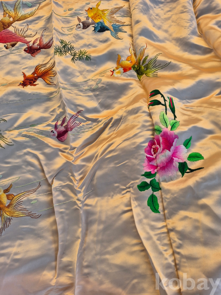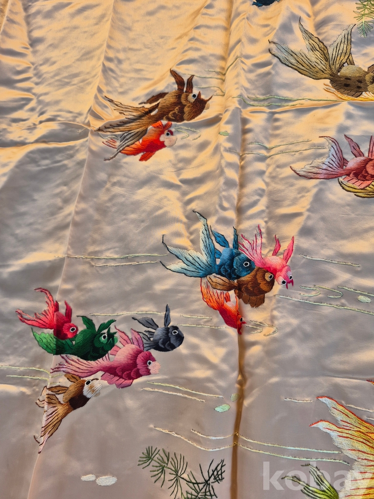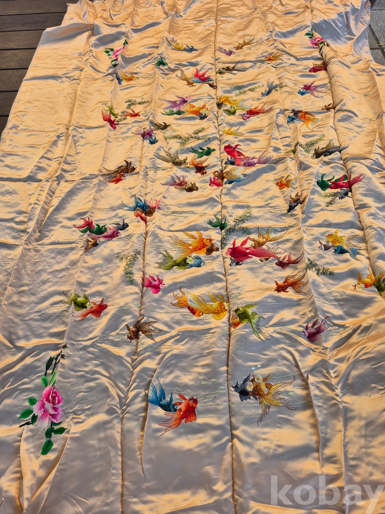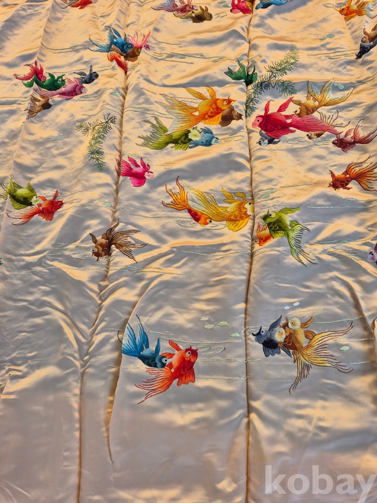 꽃과 금붕어가 화려하게 수놓아진 이불보입니다.