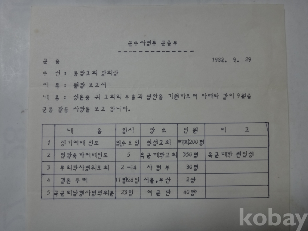 군종 활동사항 보고 - 군수사령부 군종부 (1982년, 용암교회