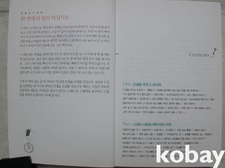 표지에 "한번만 뒤집어 생각하면 인생이 즐거워진다"란 말이 있고, 뒤표지에는 거꾸로 다시 시작이라며 <생각을 뒤집는 인생사전 101>이 쪽수 역순으로 수록되어 있다. 짧막한 말들을 그래픽과 함께 7장으로 구성하였다.