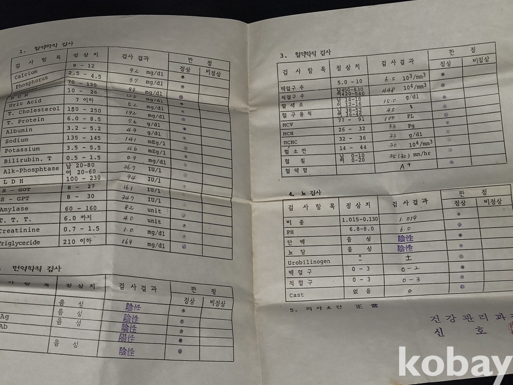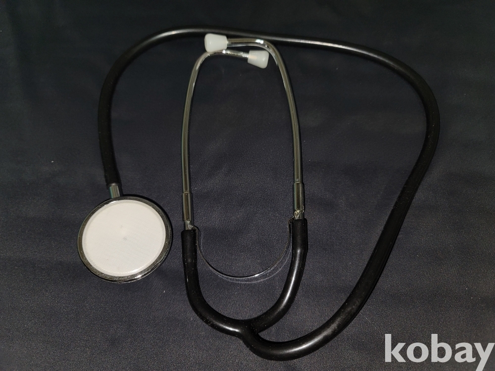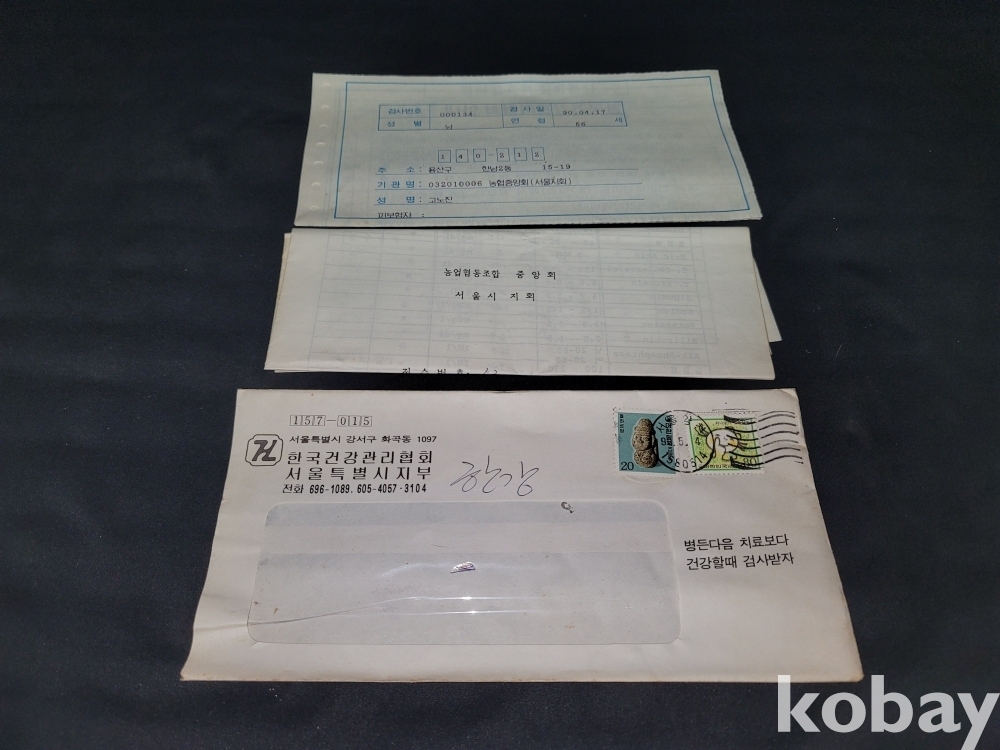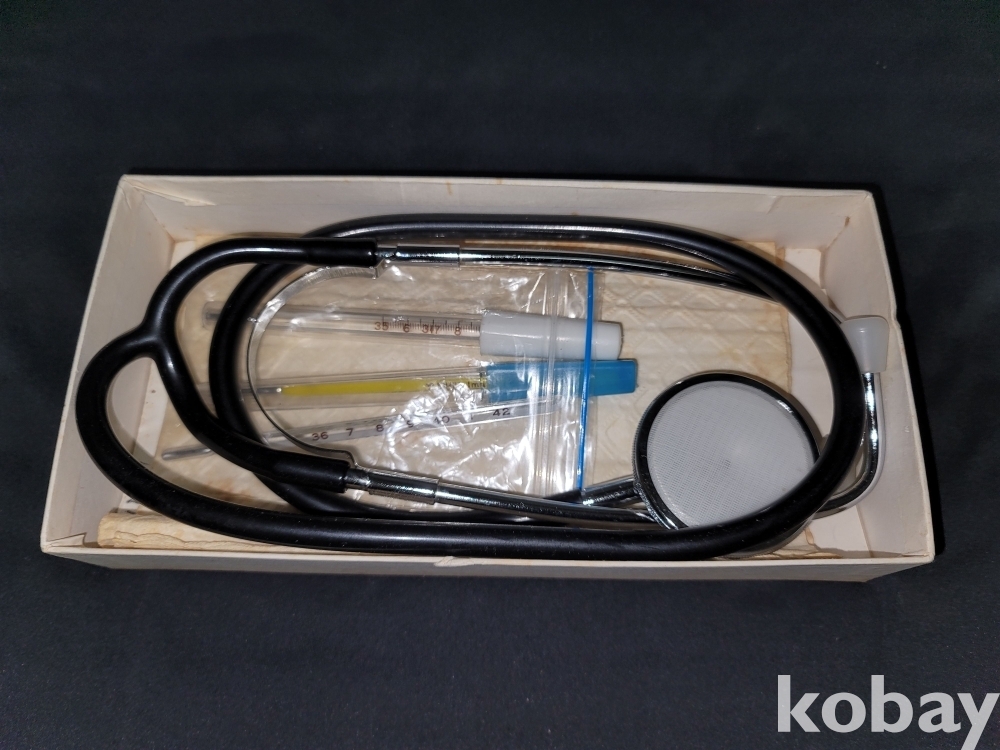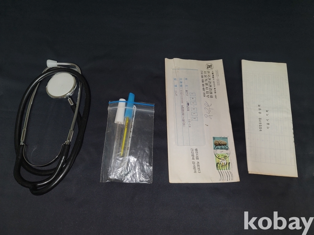 빈티지 세월 감이 느껴지는 청진기, 체온계 3종, 건강 검진표 등 일괄입니다.