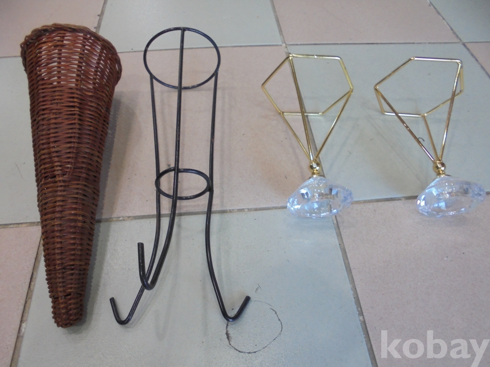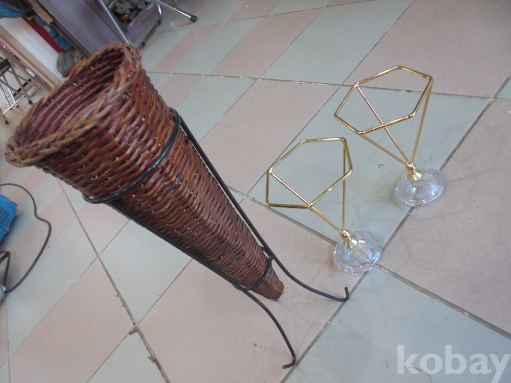 등나무껍질로엮은 위가넗고 아래가좁은 통발과 여기에맞는 철사삼발이 꽃꽂이등과 고급 스텐류 위가6각형 아래가좁은 기구그로 다용도사용하는