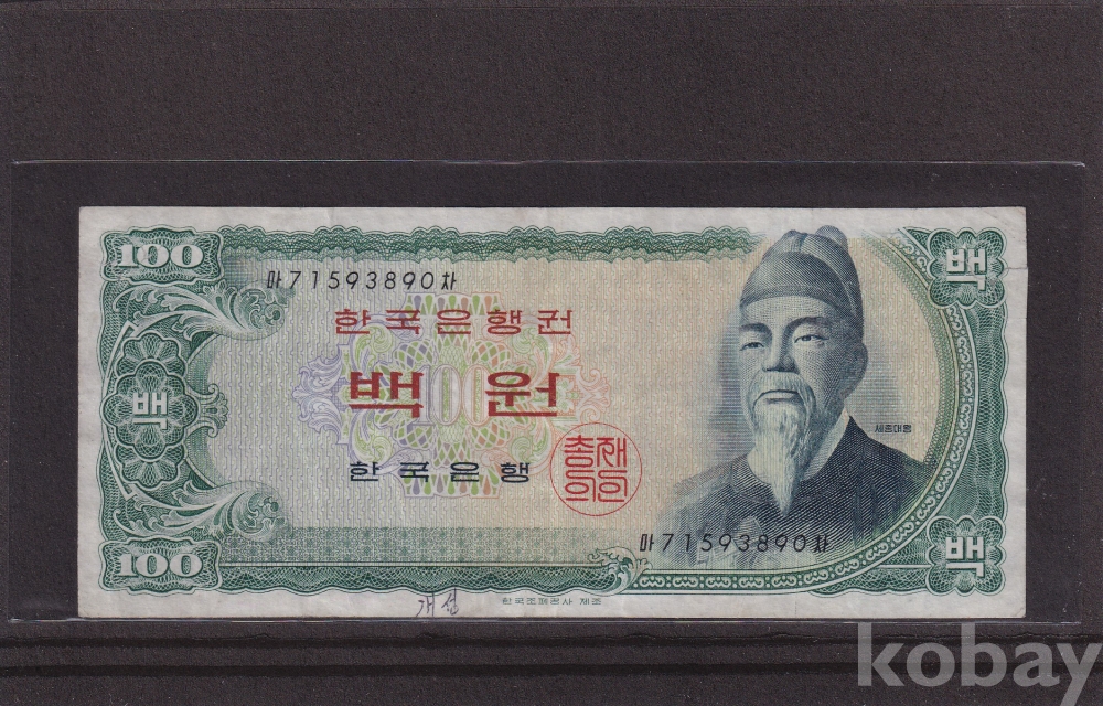 - 한국은행 1965년 세종 백원 줄세우기 7포인트 사용제 지폐