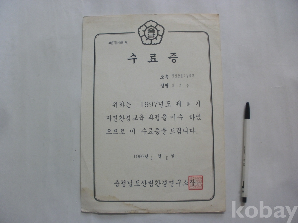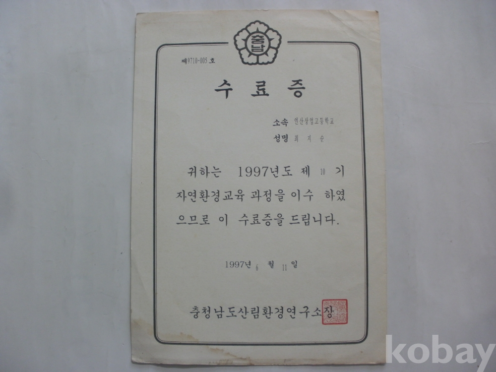충청남도 산림한경연구소 - 자연환경교육 수료증 (1997년)