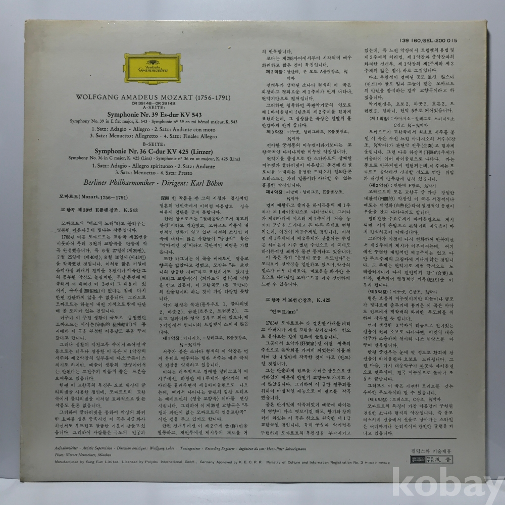 LP 36,550-61 모차르트 교향곡 제39번 제36번 - 칼뵘 . 74 성음 자켓 EX+ 알판 EX