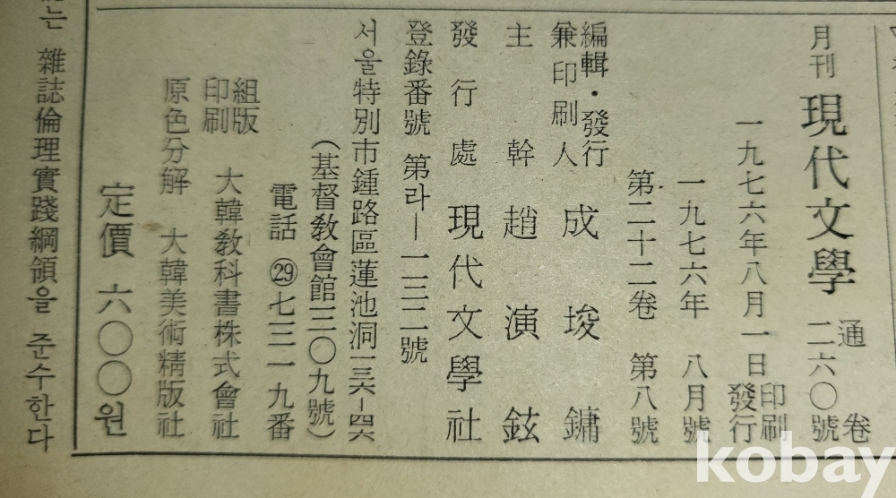 서영화가 장욱진 표지화 그림이 함께하는 "현대문학" 1976년 발행입니다,