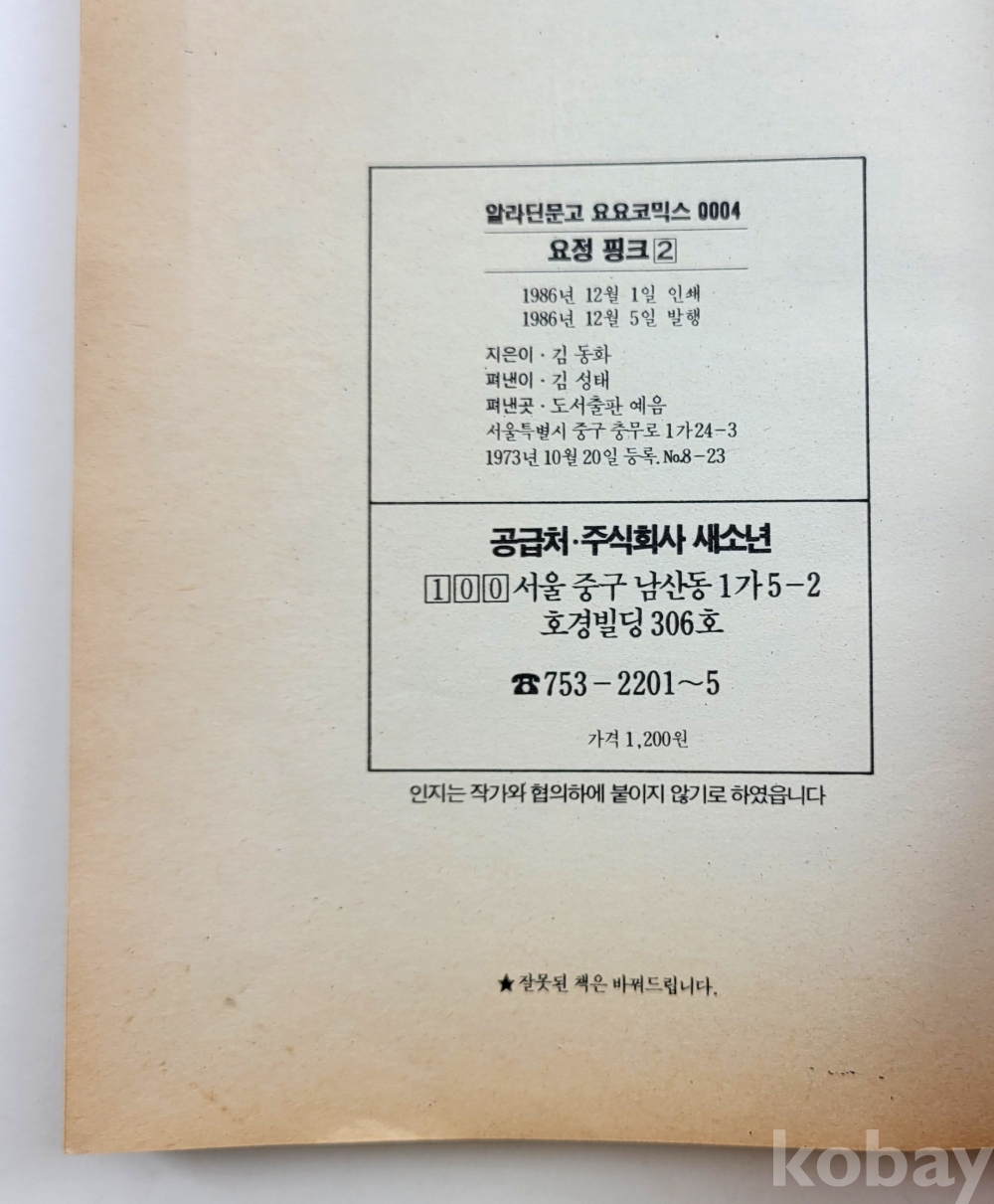 물 품 명 | [요요코믹스] 김동화 / 요정핑크 제2권 / 1986년 초판 / 도서출판 예음 |