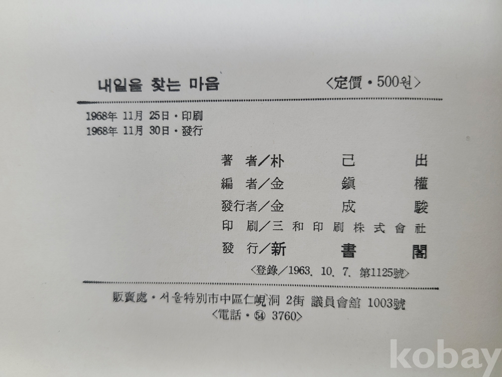 (저자증정사인본) 來日을 찾는 마음. 저자 박기출(朴己出, 1909~1977)