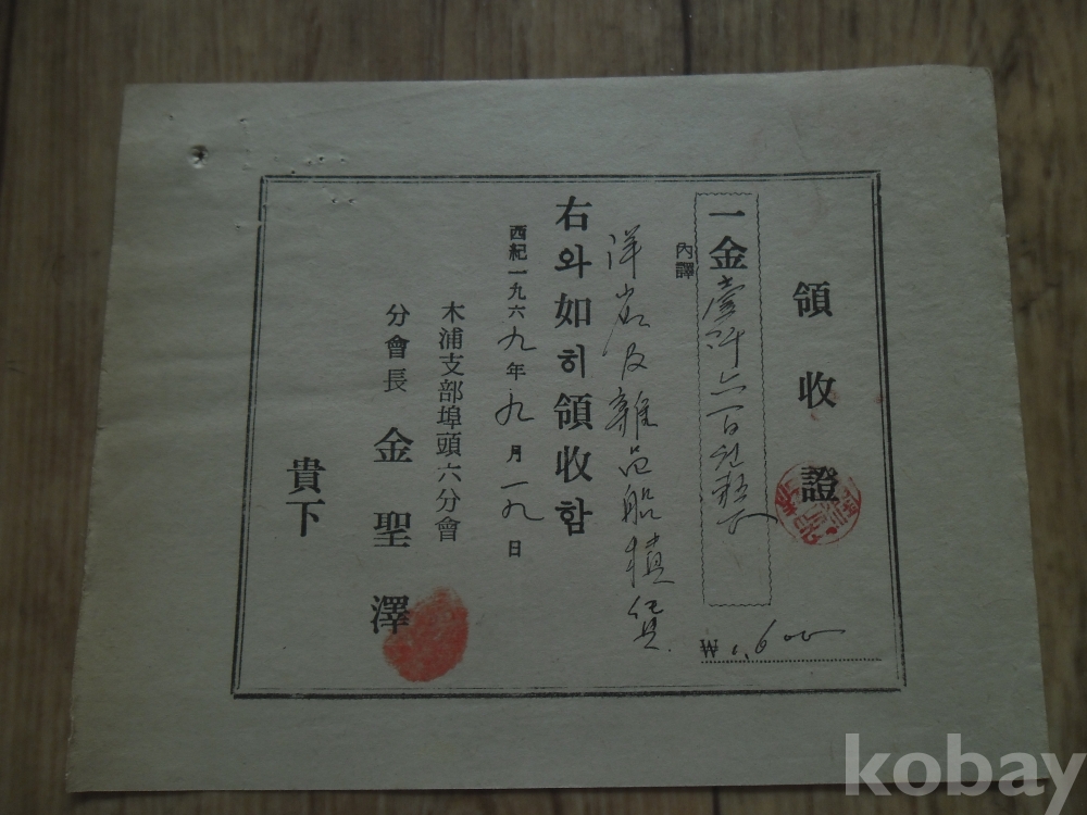 옛 영수증(계산서): 1969년 목포지부 부두육분회 영수증