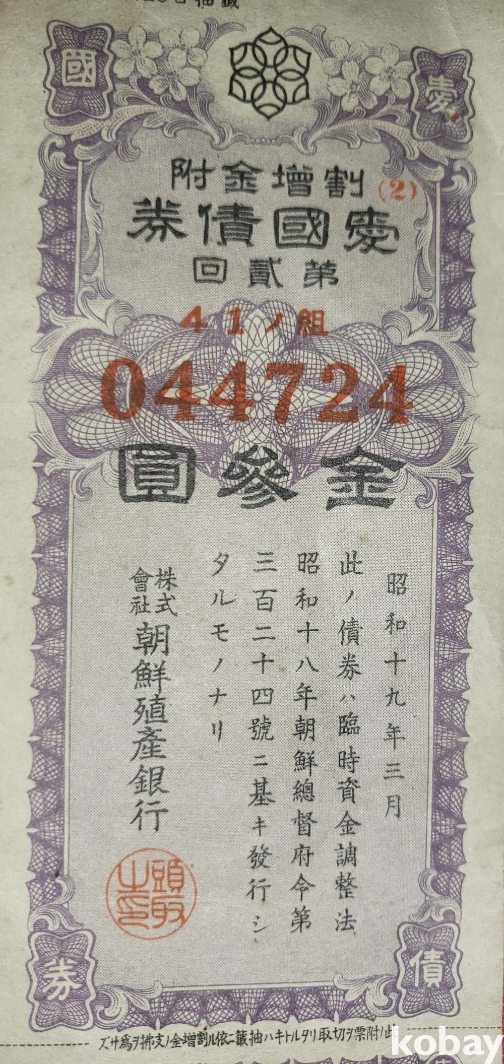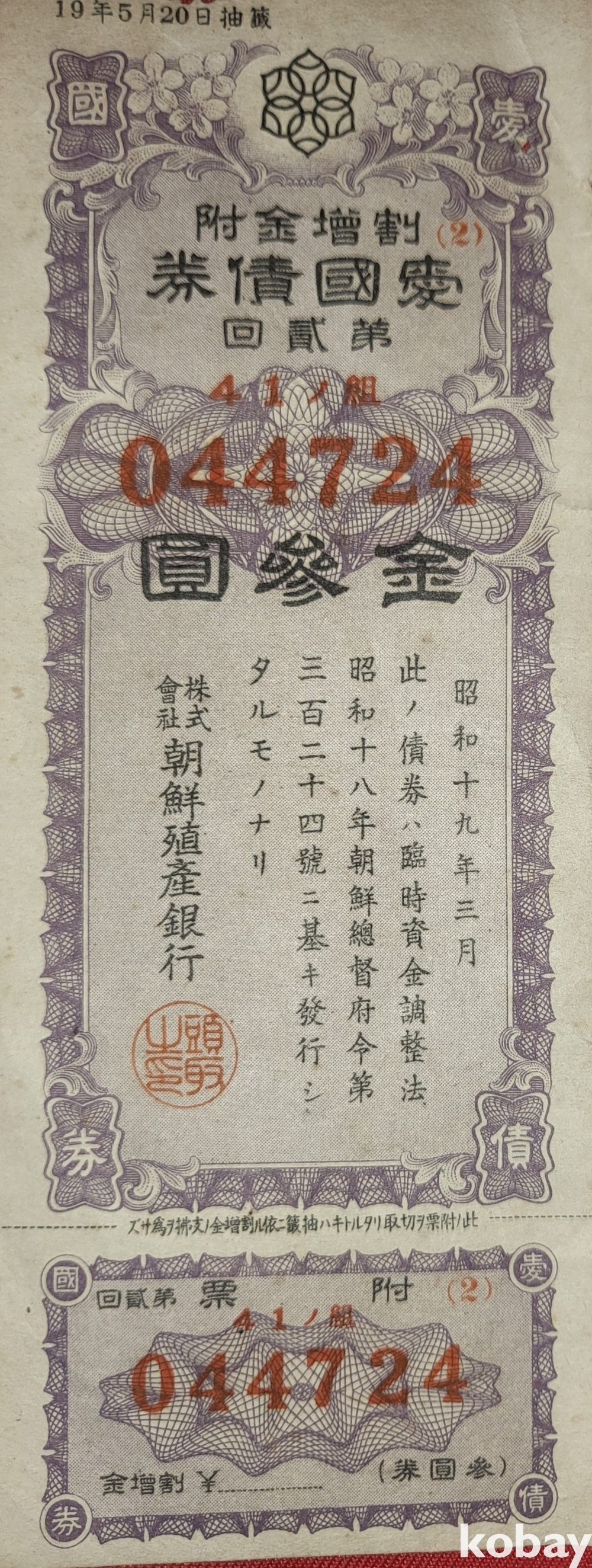 주식회사 조선 직산은행 소하19년(1943년) 발행된 할증금부(割增金附)입니다,