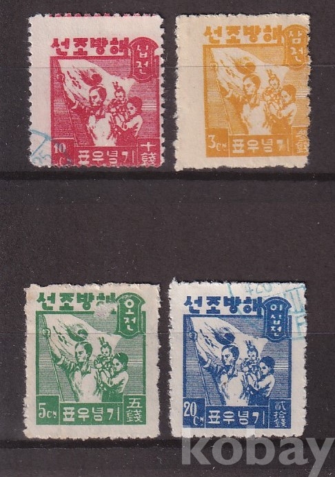 - 미사용 미군정기 해방조선기념 태극기와 가족 우표 4종 모음