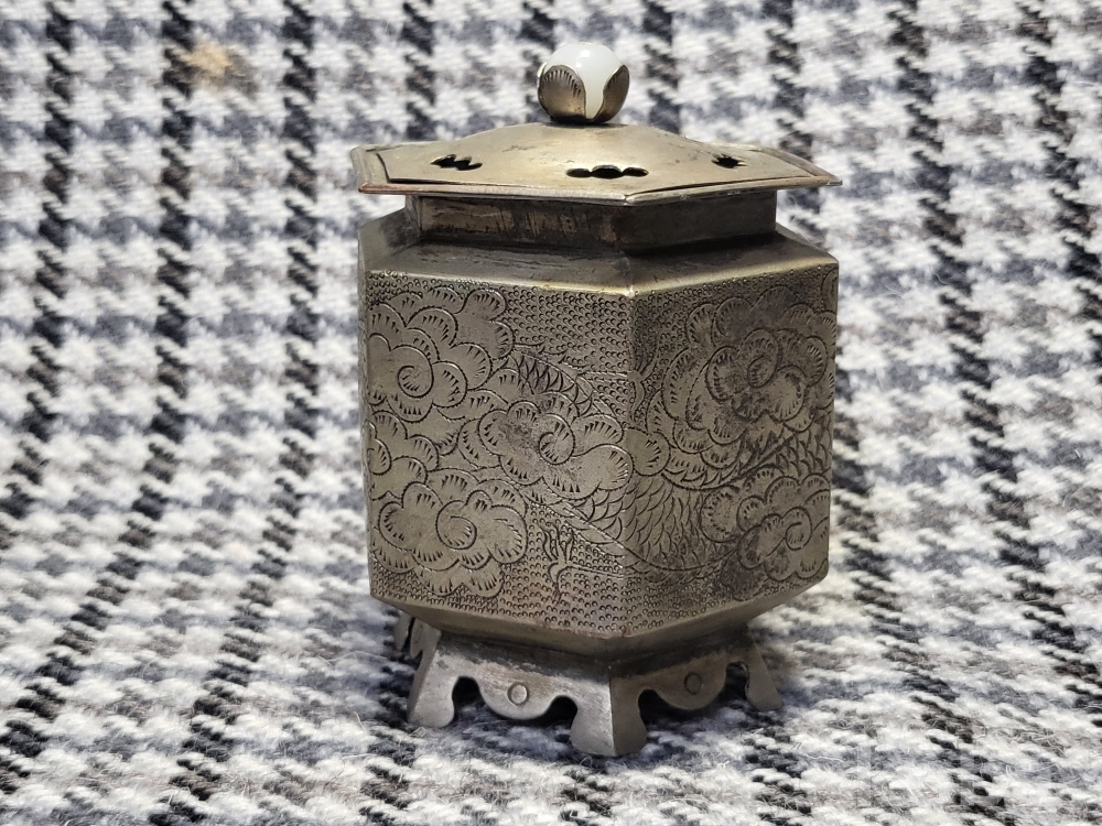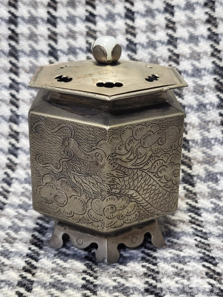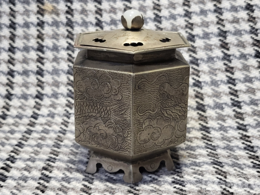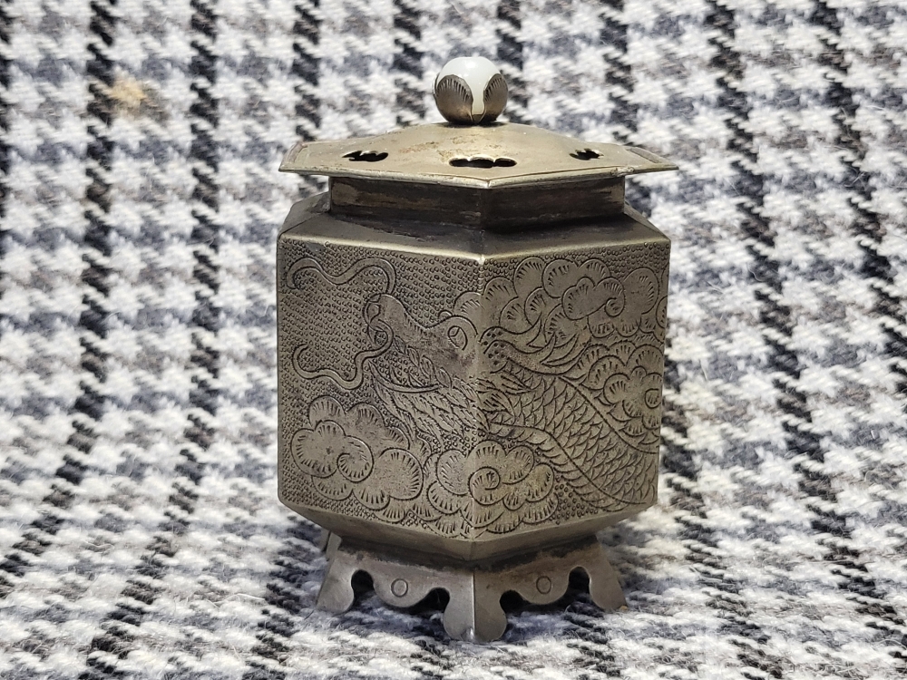 깊고 정교한 쪼이장식으로 운룡문이 새겨진 백동제 향로입니다.