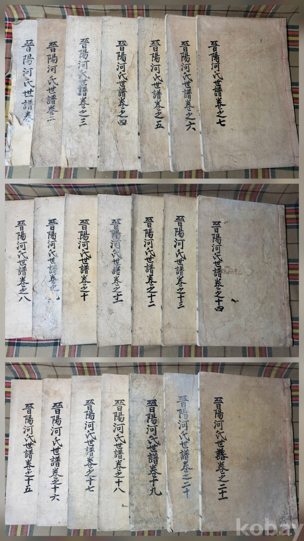 서문에 1906 병오년 21책으로 후손 하겸진에 의해 간행되는 기록이 있는, 진주하씨세보 21책 완질입니다.