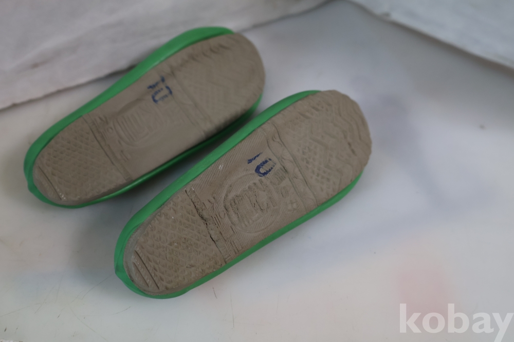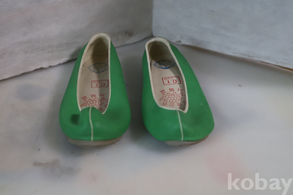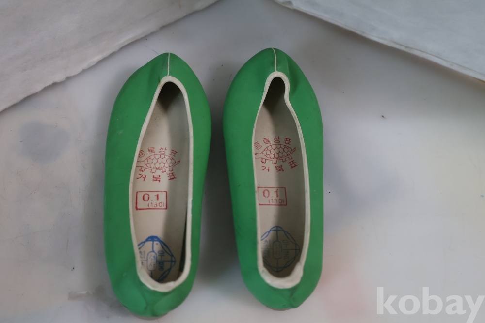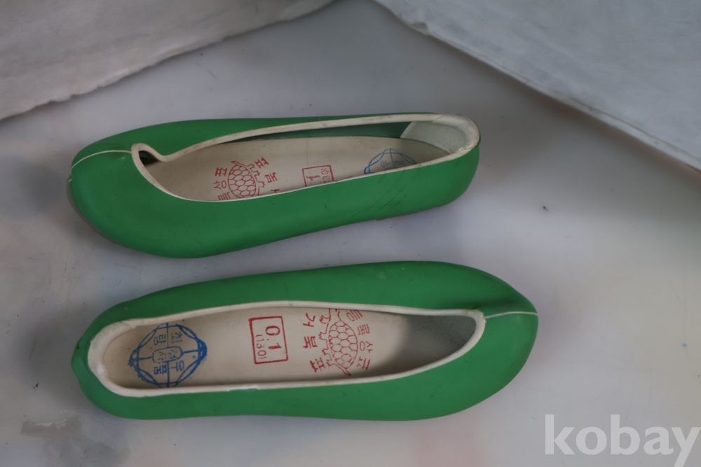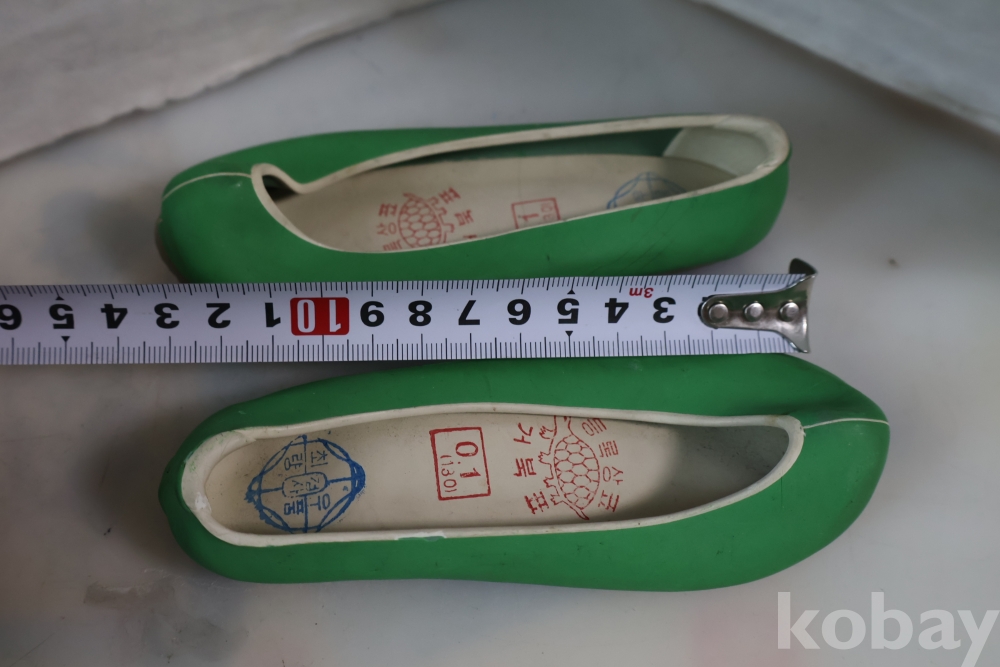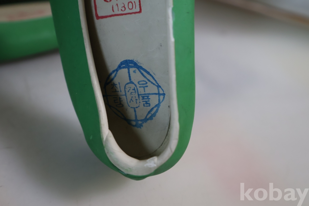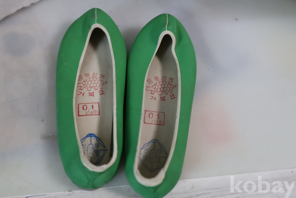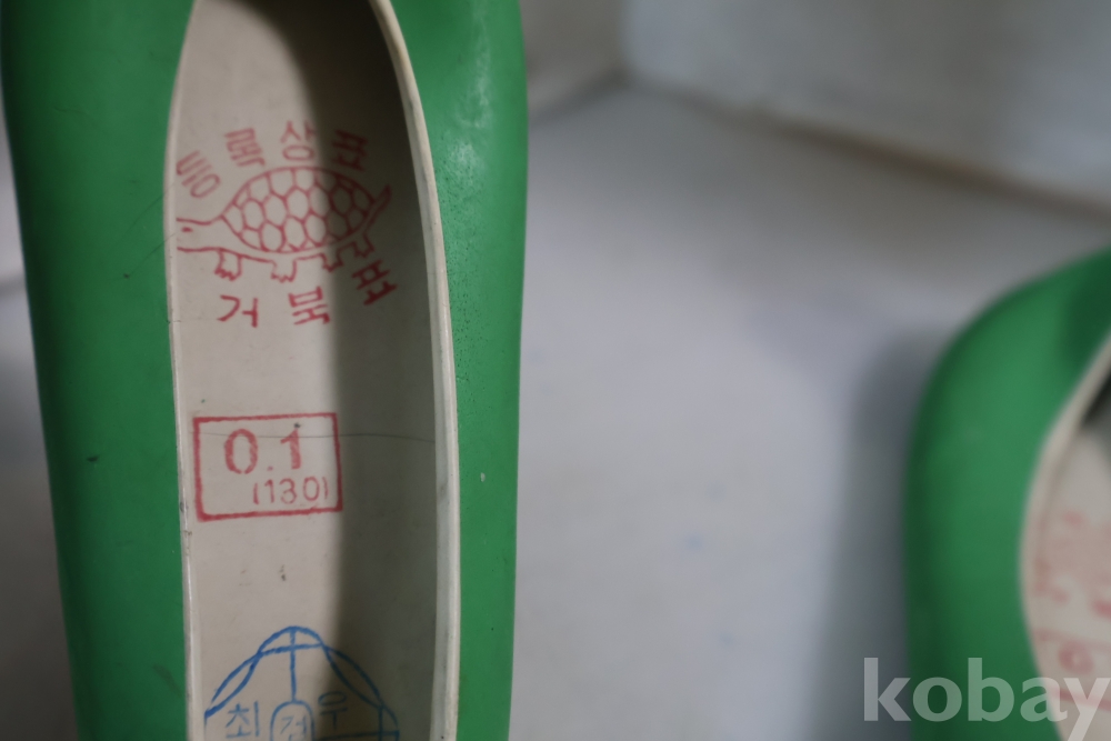 거북표 최우량품의 낙관이 보임니다 1960대 구미 유럽 수출 품 이며 고무신 이며 세월의 흔적이 보임니다 고무상 딱딱해져서 앞부분이 눌려져 있읍니다 오랜기간 진열장에 보관해온 귀한 명품 임니다