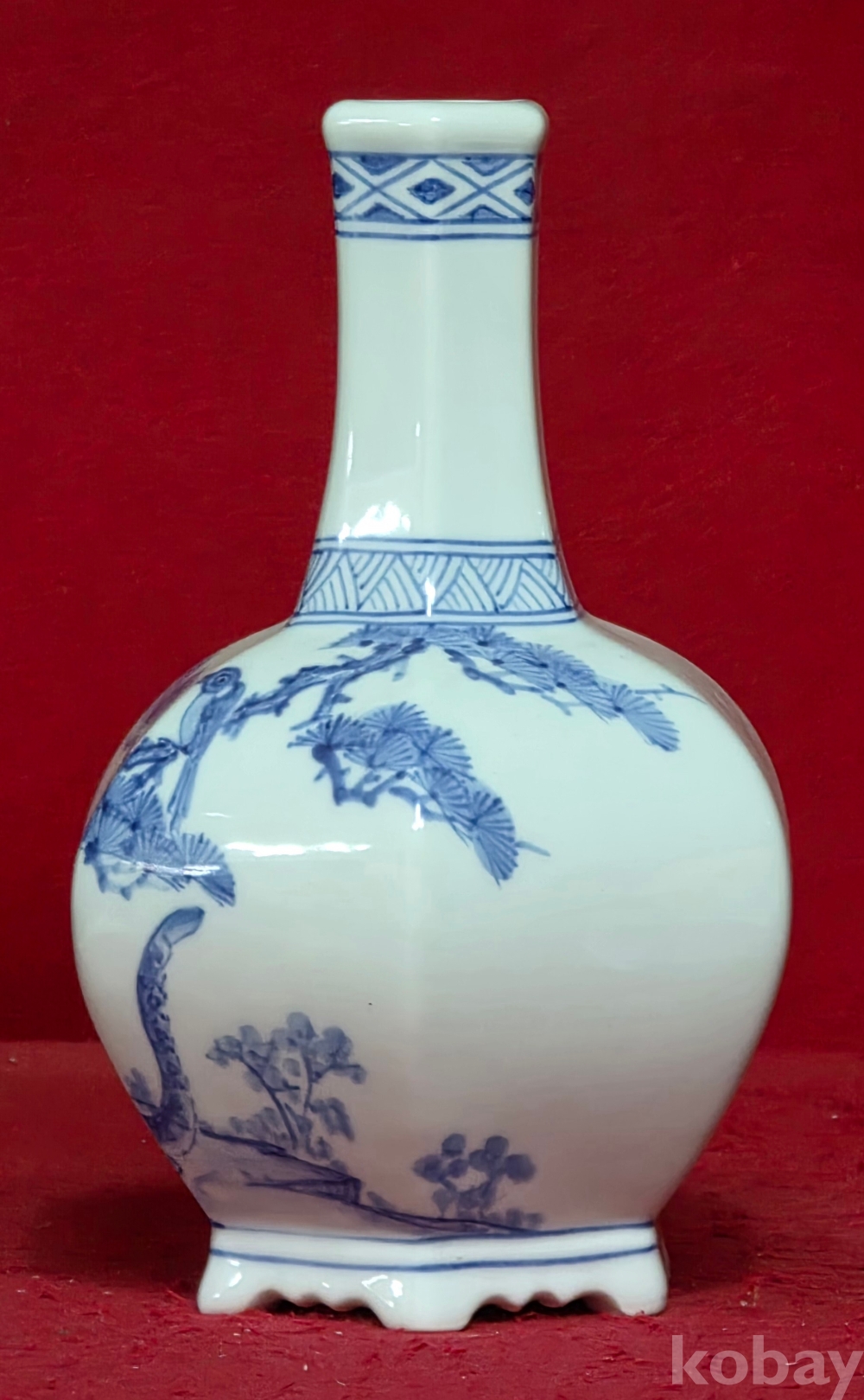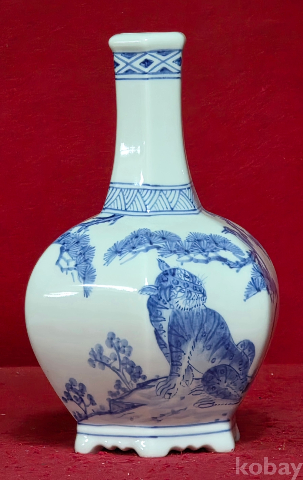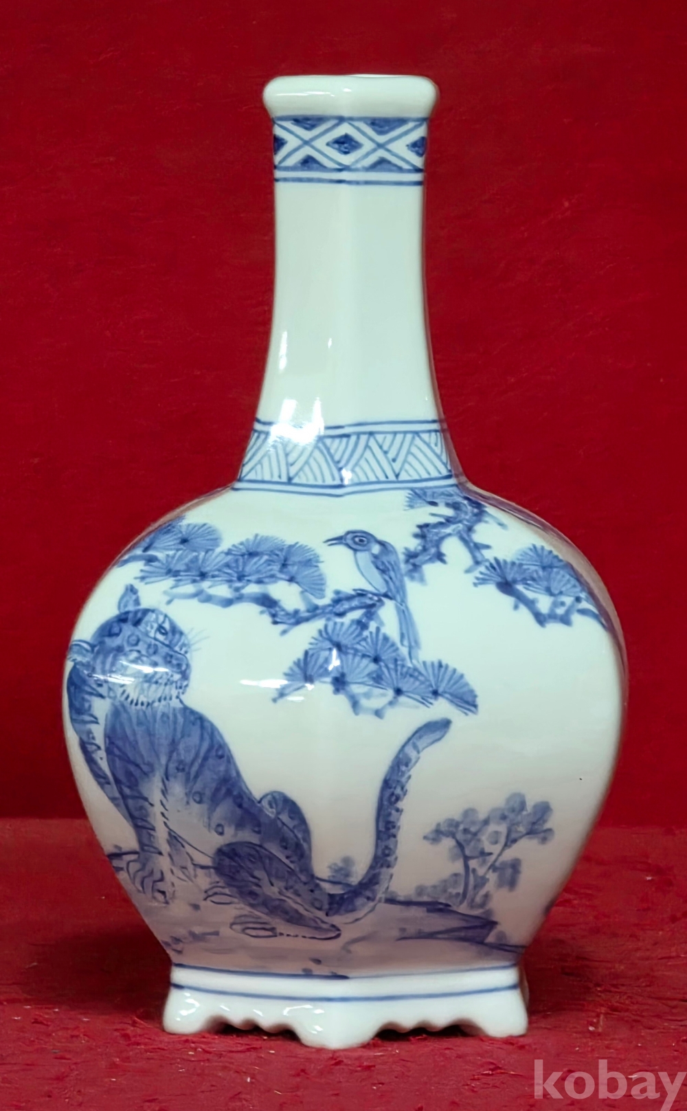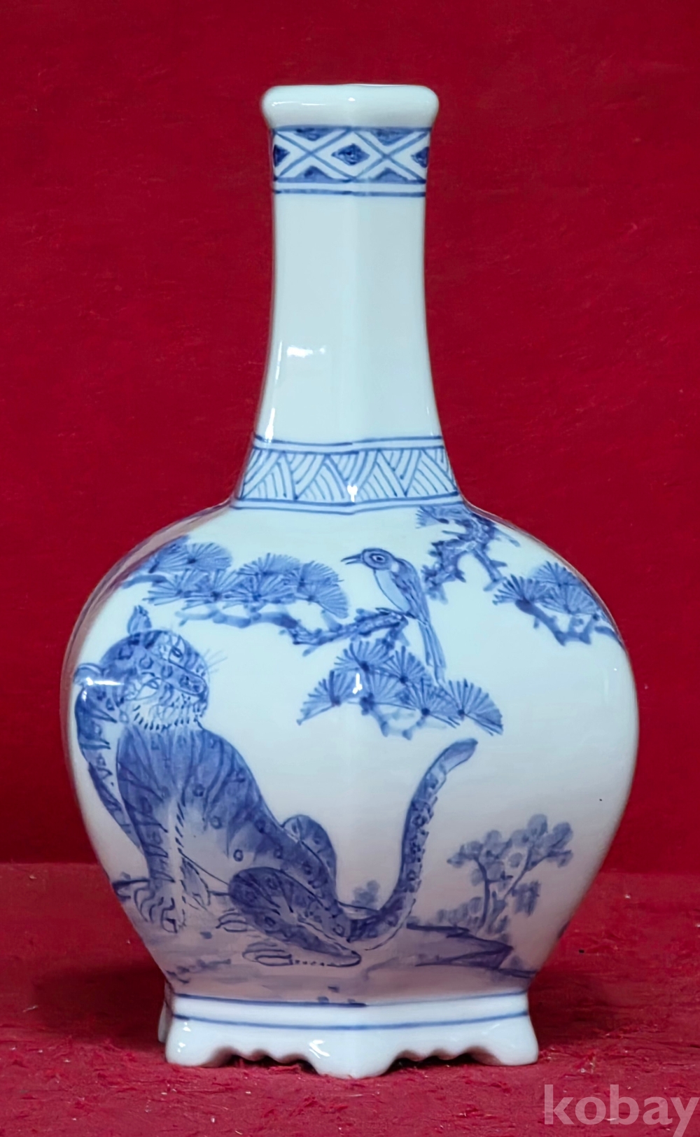 여주 도예명장 석담 최병덕 명장의 청화백자 까치 호랑이 6각 주병 미사용 입니다