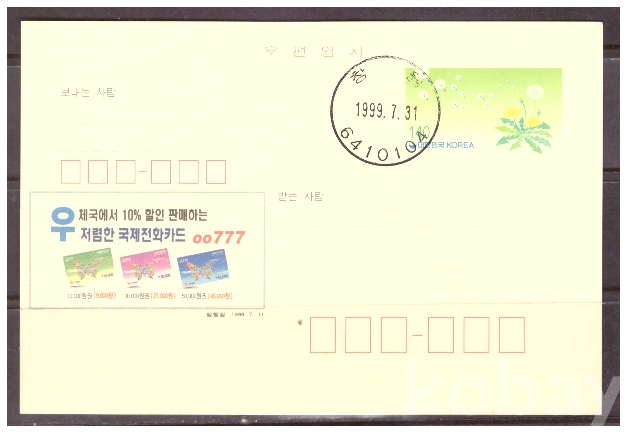 (광고엽서) 1999.7.31 지방판 LAPC355 서울국제전화 (민들레 140원) (초일일부인)