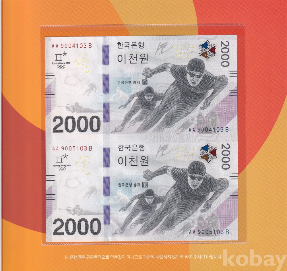 - 2018년 평창 올림픽기념 2,000원 초판 AAB 9004103 / AAB 9005103 - 2연결권 미사용 지폐 입니다.