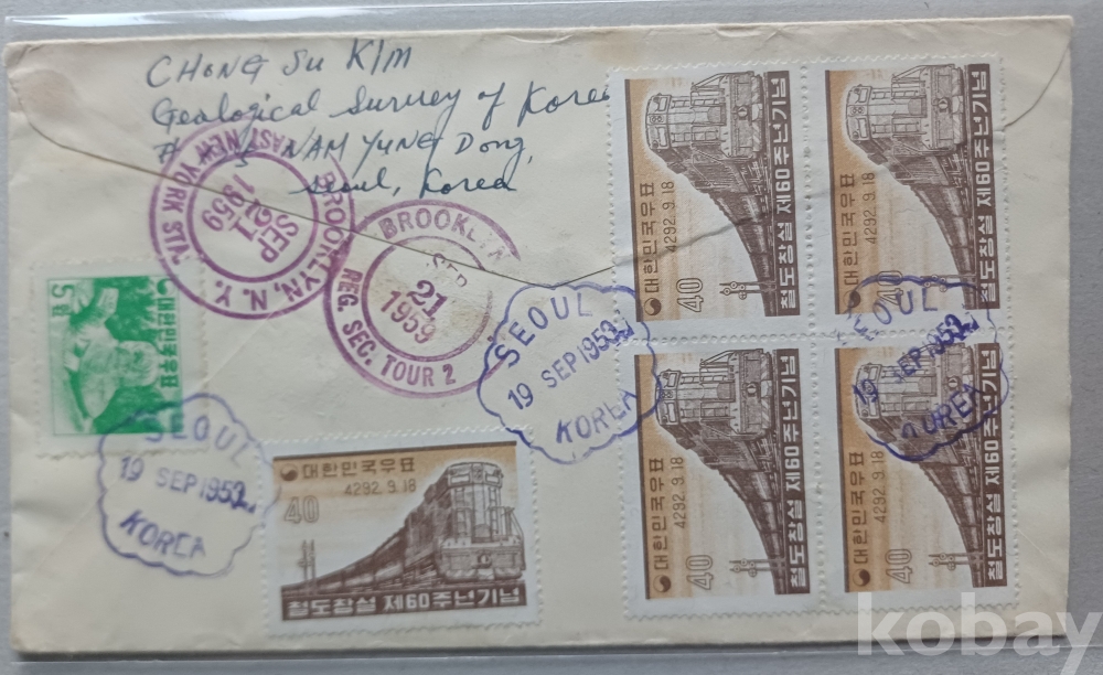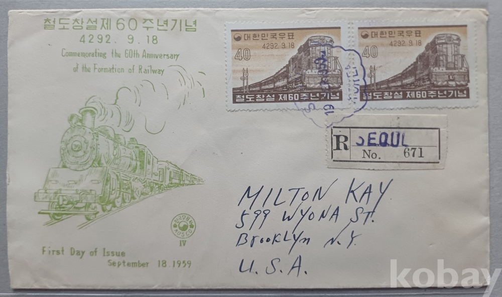 1959년 철도창설 60주년 기념 세계우표사 발행 등기 실체 봉투